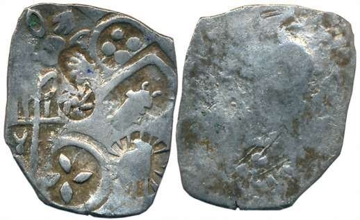 Punch Marked, Attributed to Magadha Janapada, Silver Karshapana, 3.21g, Uniface, Five symbol type including sun, six armed, candelabra, four dots in circle, four pellets in circle and animal symbol within square area on obverse (Rajgor Series 12). Very fine.