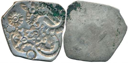 Punch Marked, Attributed to Magadha Janapada, Silver Karshapana, 3.37g, Uniface, Five symbol type including sun, six armed, taurine on crescent, three fishes attached to circle and traces of other symbol on obverse (Rajgor Series 12). Very fine.