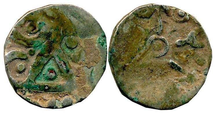 Punch Marked, Attributed to Kuru Janapad (Haryana Region), Silver 1/2 Karshapana, 1.56g, “Babyal Hoard” type, Obv: Six armed symbol, Rev: Triangular with dot (Rajgor Series 21). Uncleaned, very fine, rare.