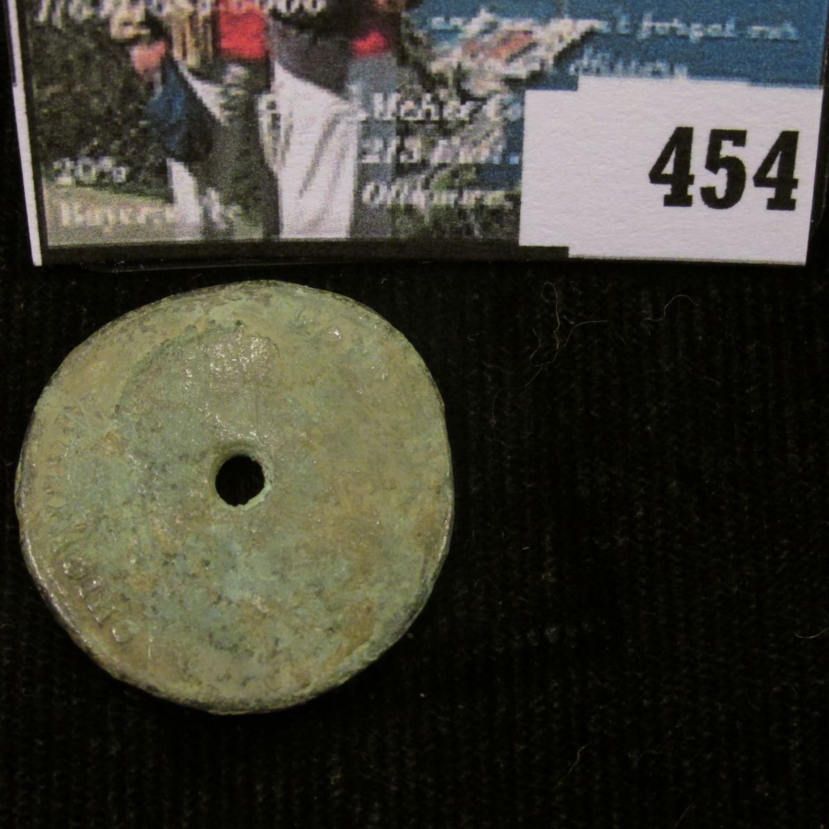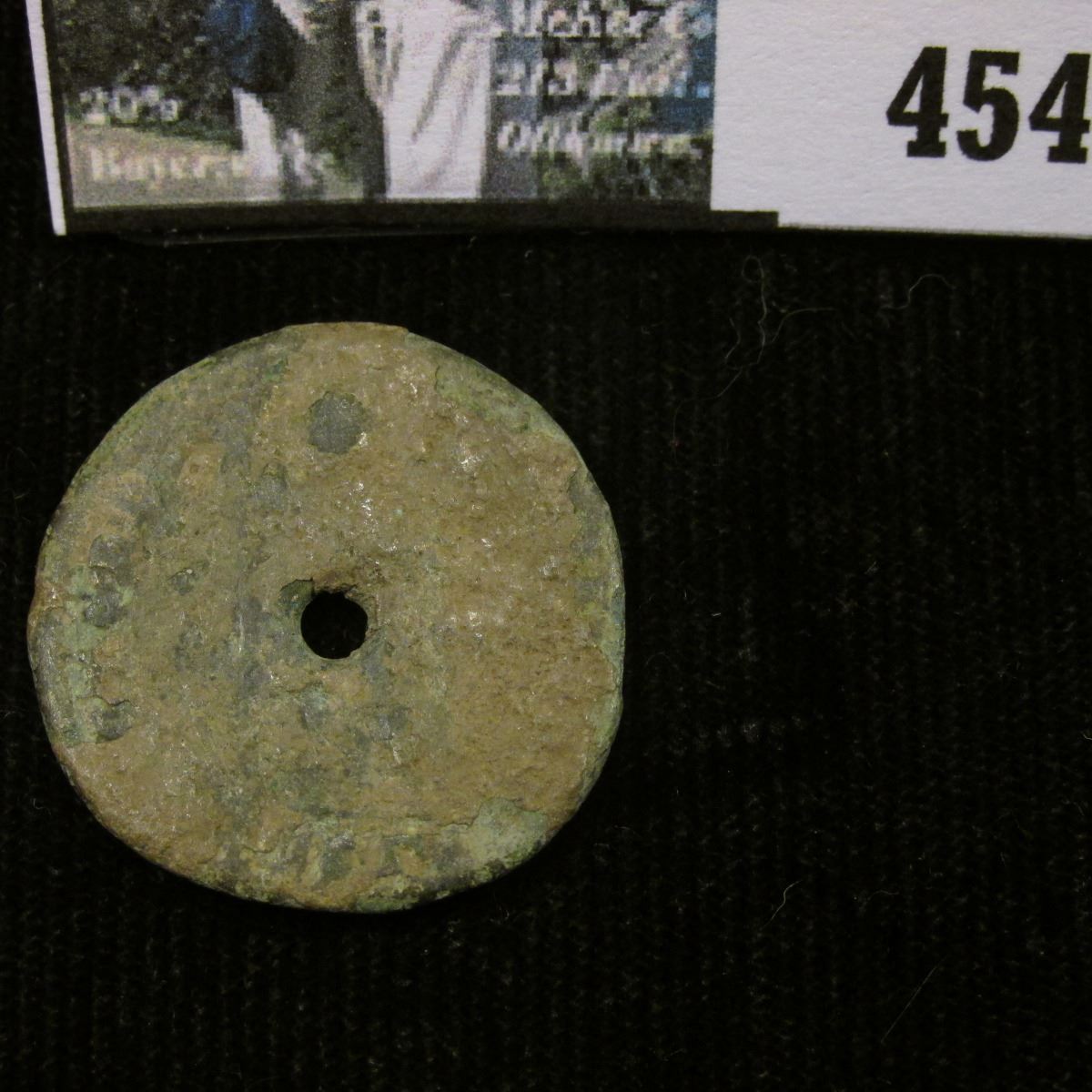 Ancient Roman Copper Coin depicting Ruler, holed. Approximately 2,000 years old. May have been used as a button.