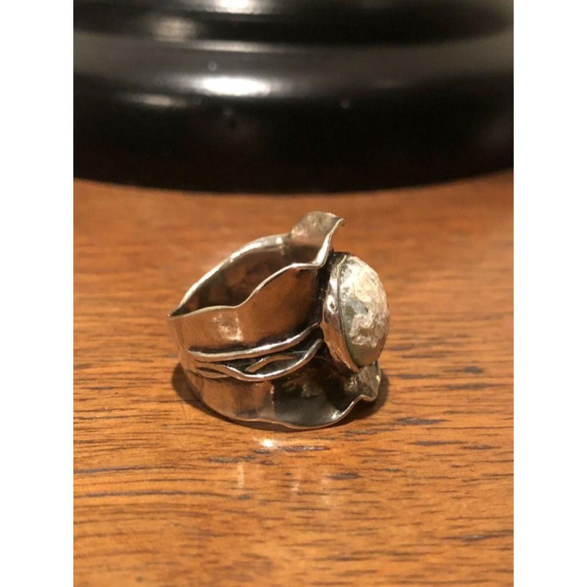 Modernist style sterling silver ring, bezel inset with tiny shards of ancient Roman glass. Size 7.