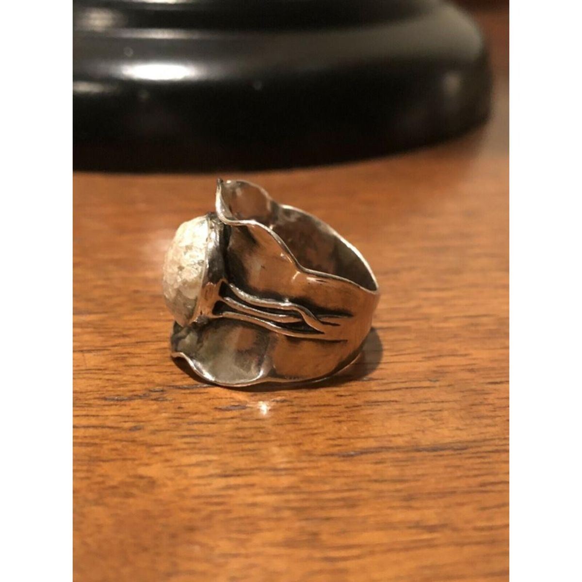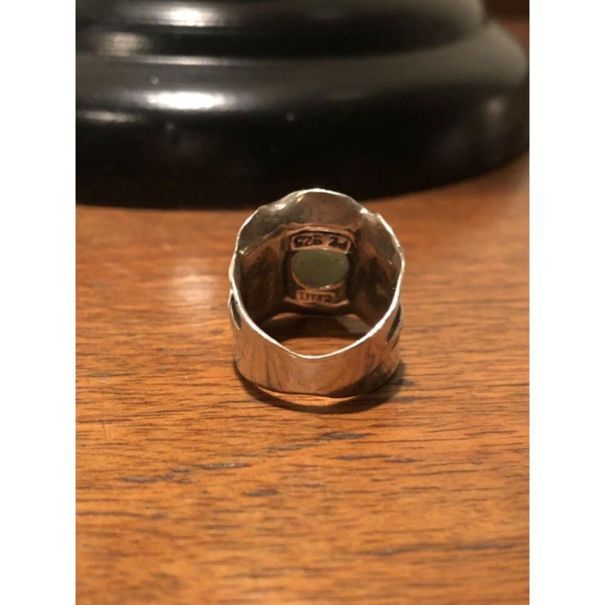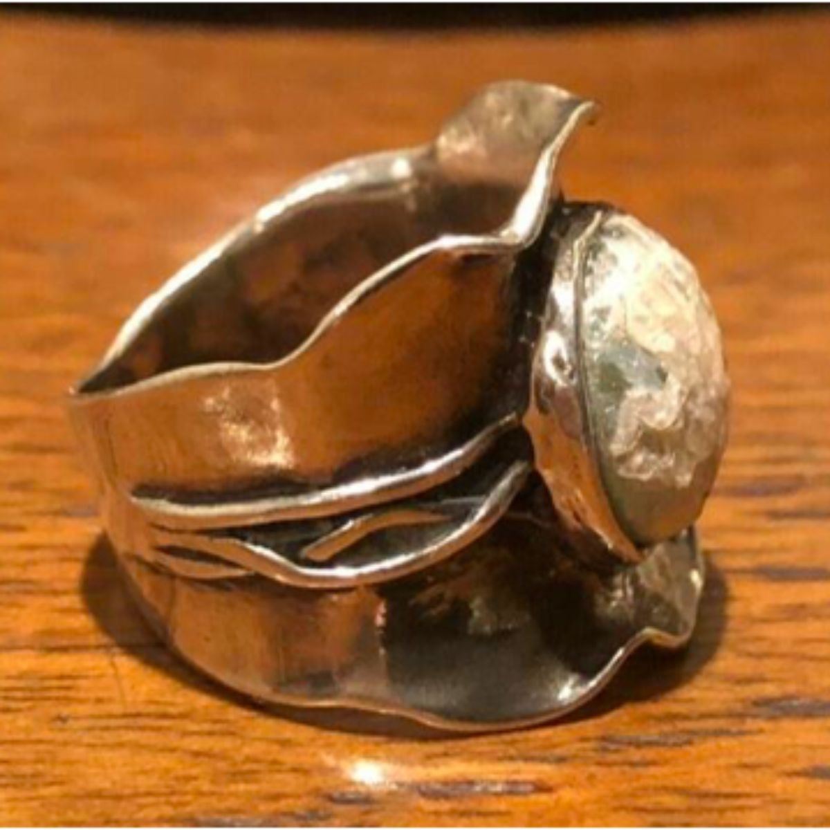 Modernist style sterling silver ring, bezel inset with tiny shards of ancient Roman glass. Size 7.
