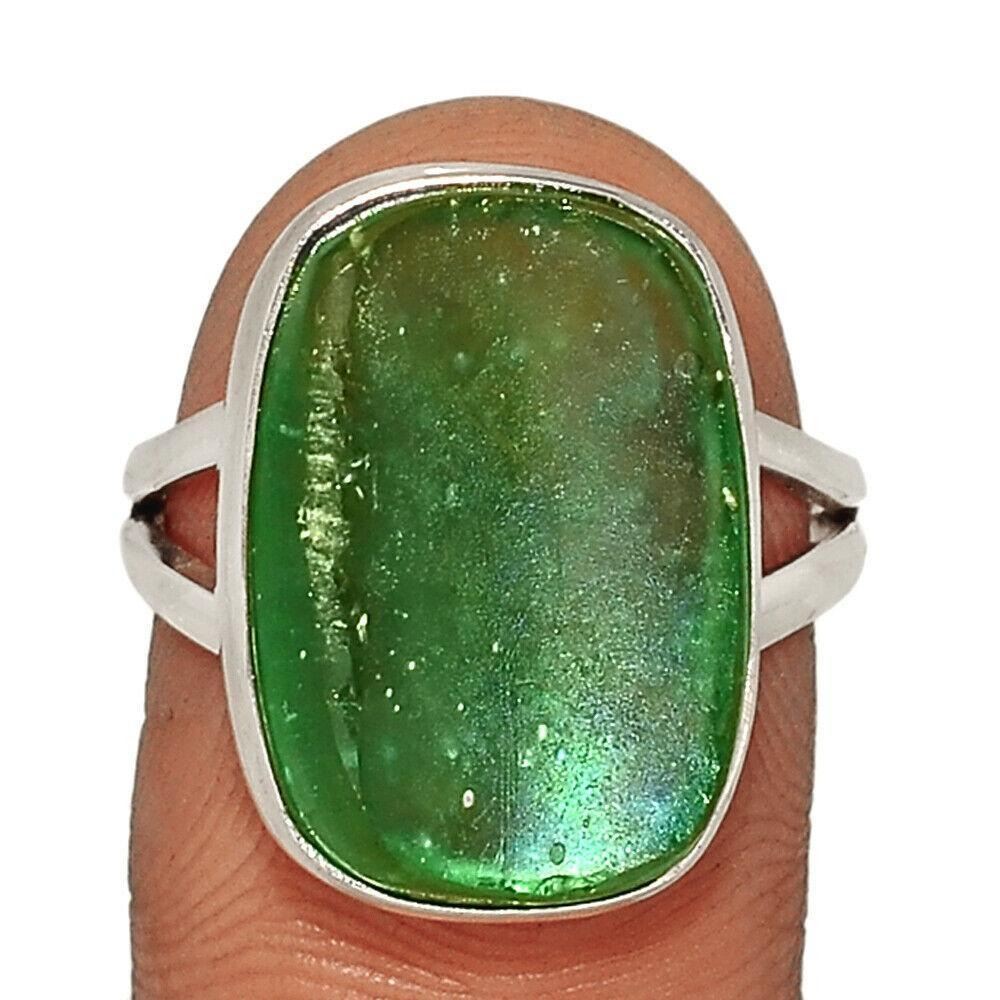 Shard of ancient Roman glass (20x12mm) set into a stamped 925 sterling silver modern style artisan ring. Size 7.5. 5.1 grams weight, glass & silver.Â