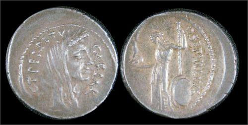 Ancient Roman. Julius Caesar, life time issue silver denarius of February to March of 44 BC.  Obverse : Veiled head of Caesar right, with CAESAR DICT PERPETVO around (the DI is not struck up).  Reverse : Venus standing left, holding Victory and a scepter,