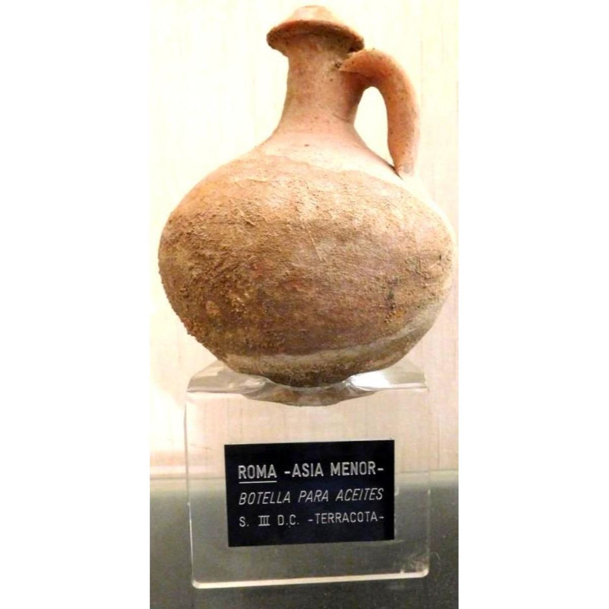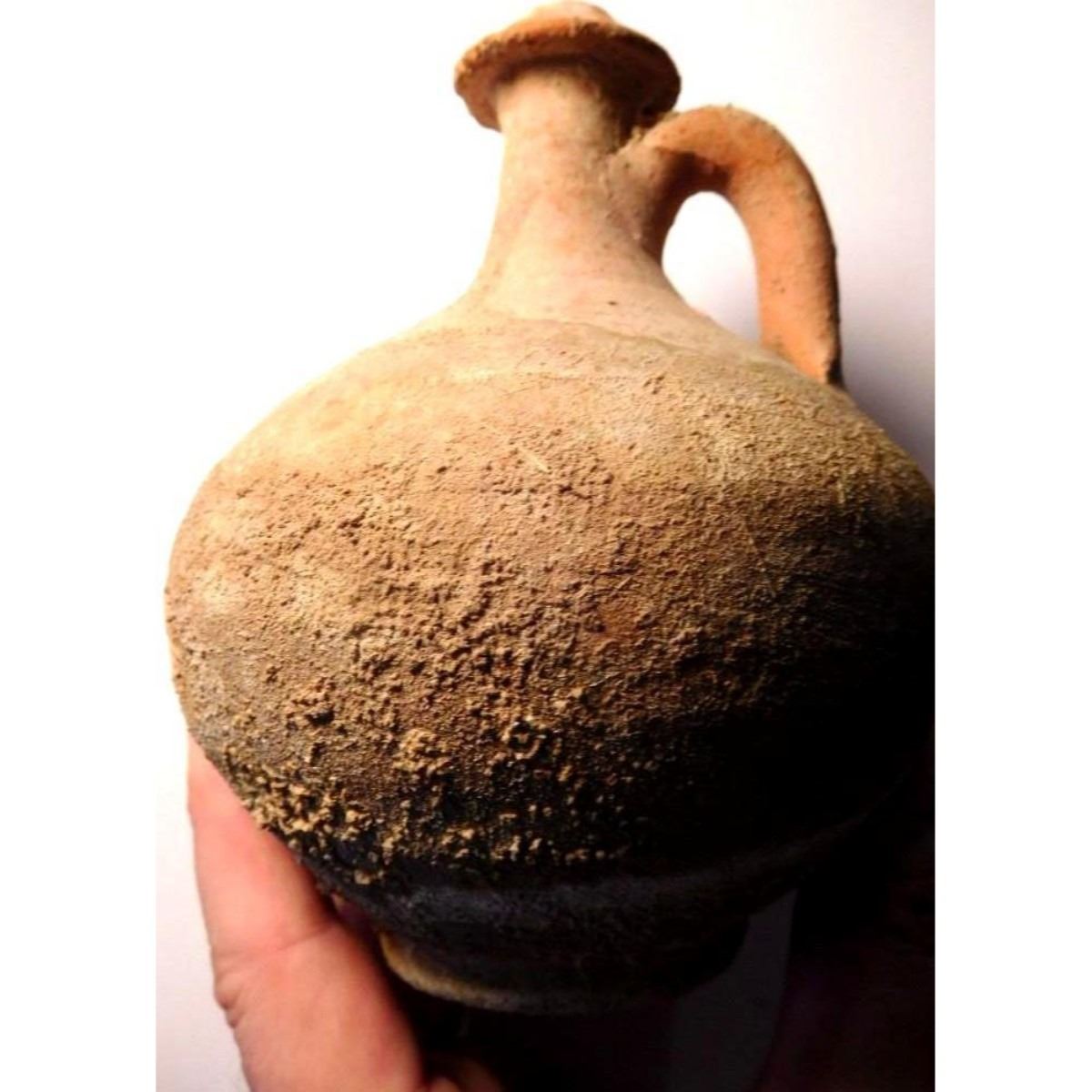 This terracotta vessel, from the 3rd century A.D., once held oils or some other valued commodity, as evidenced by the narrow opening. Comes with display stand. Dimensions without stand: about 6" x4" x4". $250.00 reserve JC-30101-23 JC-30123
