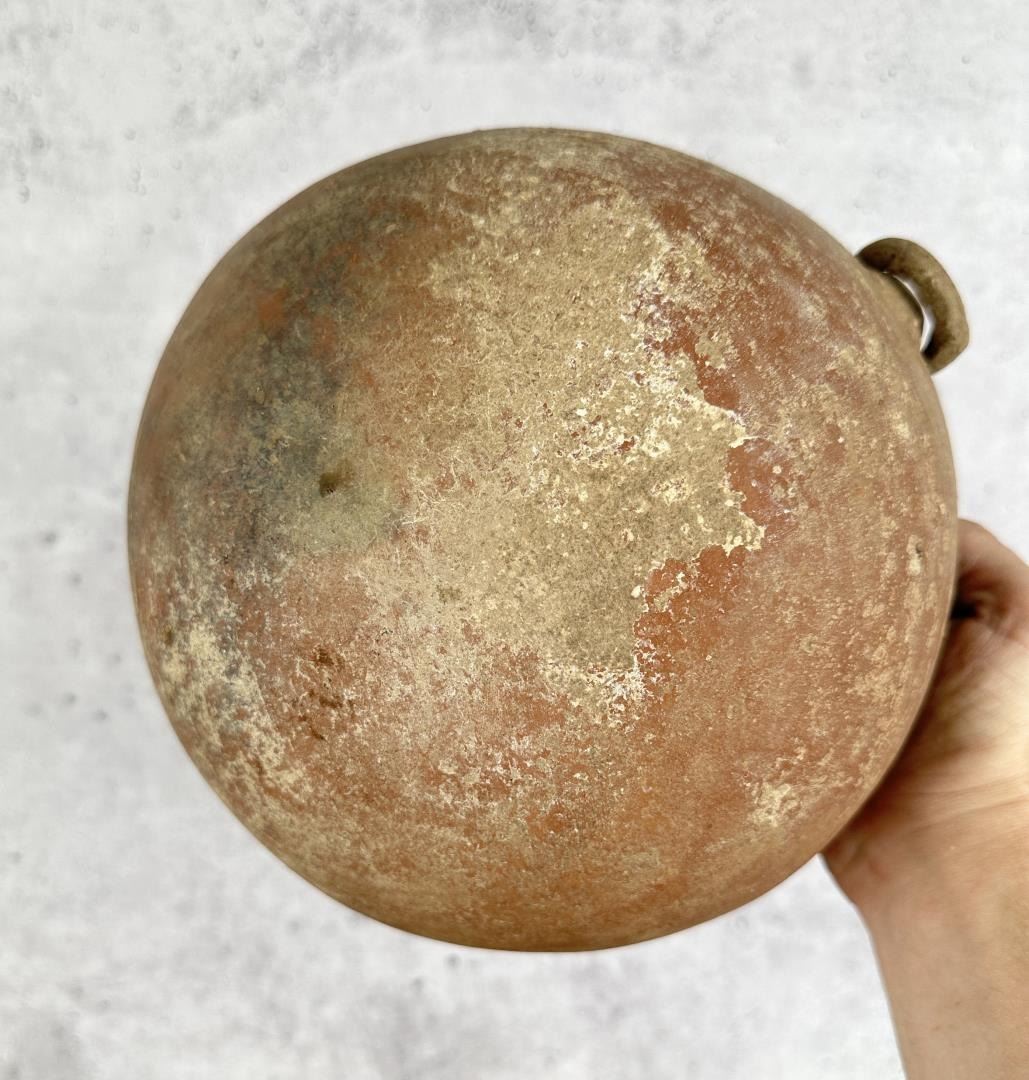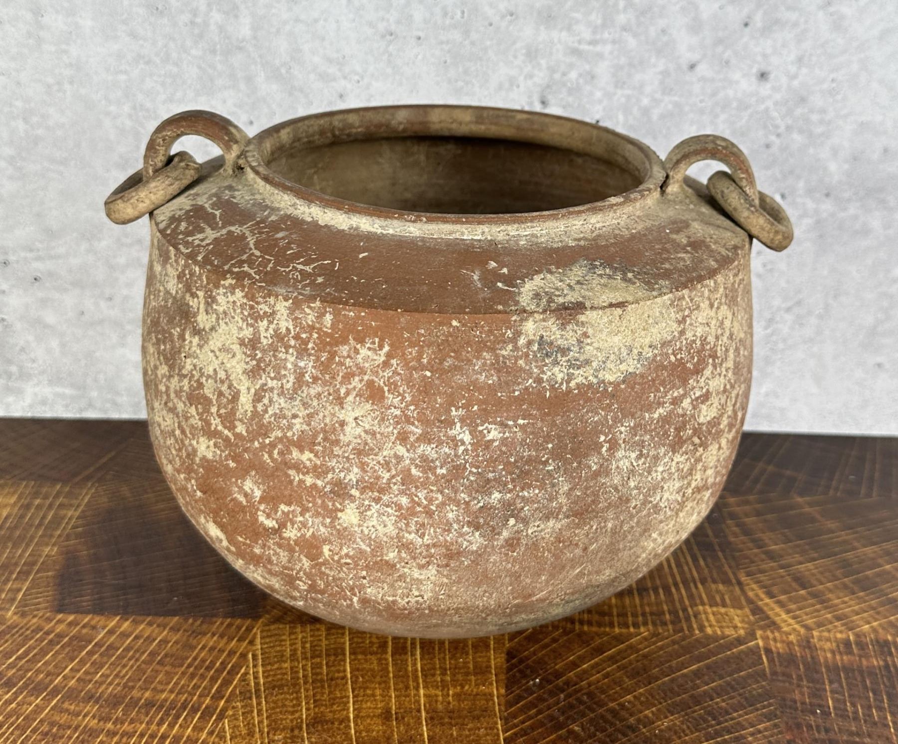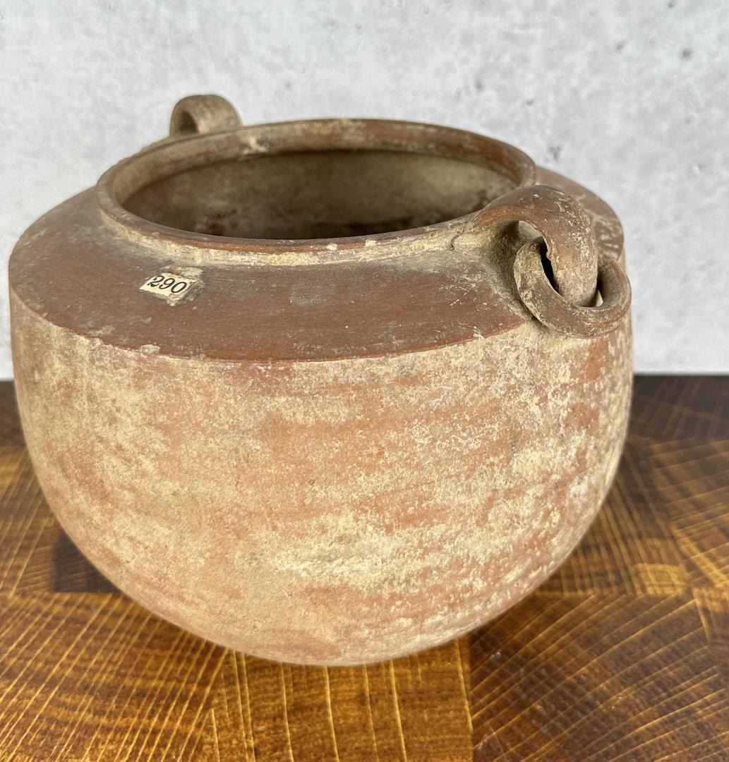 Unusual ring handle form. Old museum label on the side as shown. 7 1/2" tall, 8 3/4" diameter.