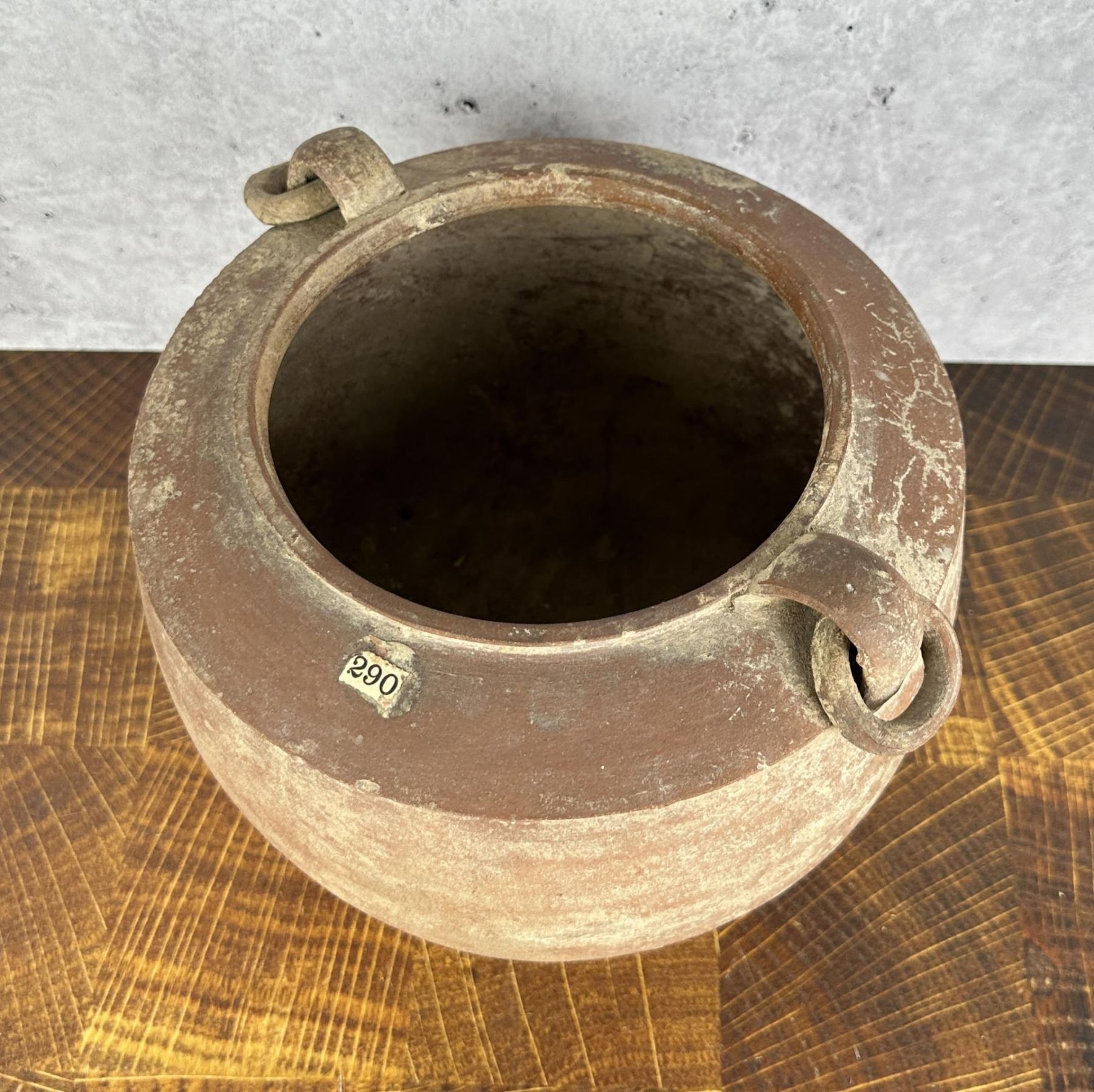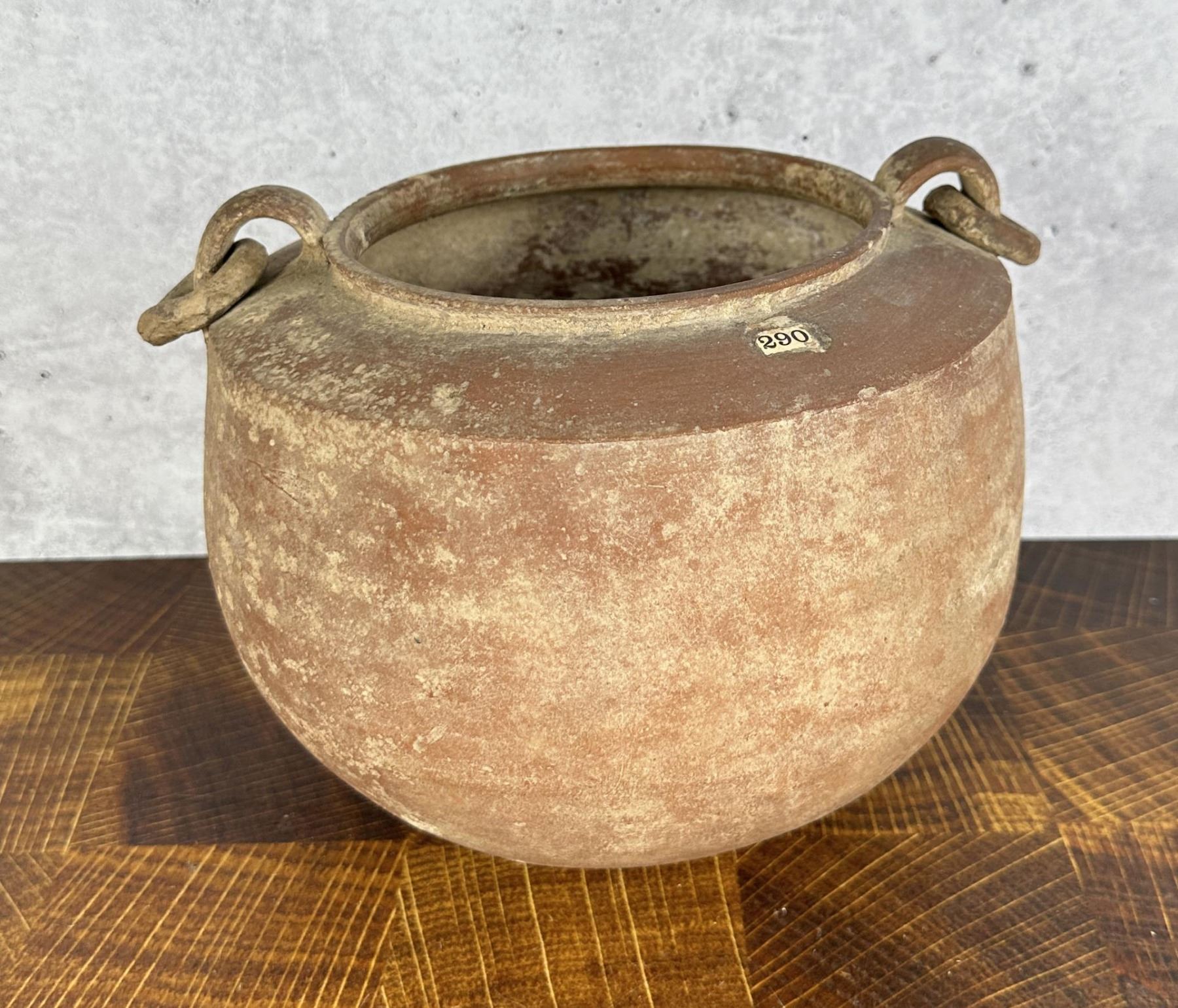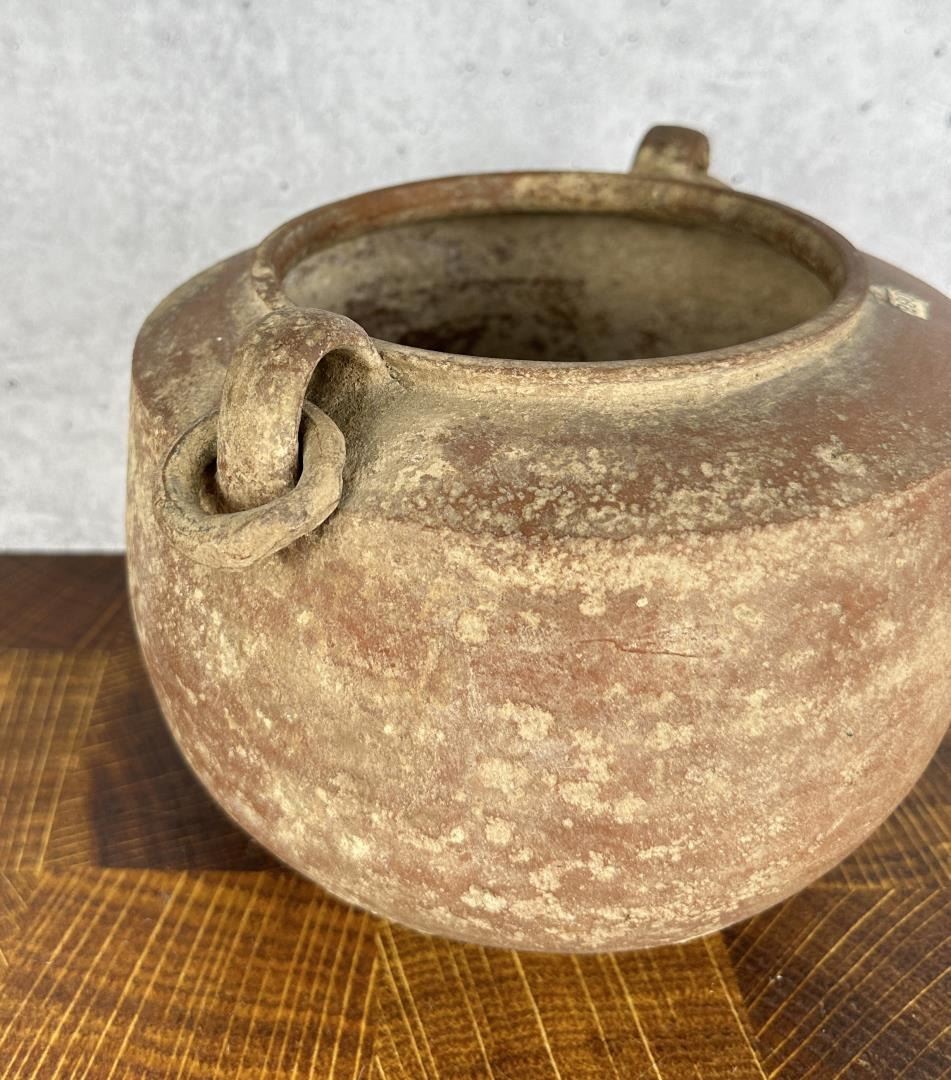 Unusual ring handle form. Old museum label on the side as shown. 7 1/2" tall, 8 3/4" diameter.
