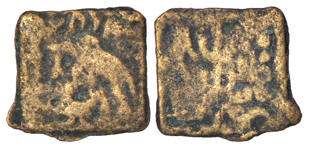 Ancient Saketa region - monarchical cast coinage of Ayodhya area. 'elephant'-type coin of Sivadatta (c.150-100BC), not listed in PAIC, 0.76g. Obv: elephant walking to left; Brahmi legend Sivadatasa above. Rev: Shrivatsa in centre, 'Ujjain’ symbol and palm tree to right, standard in railing to left.