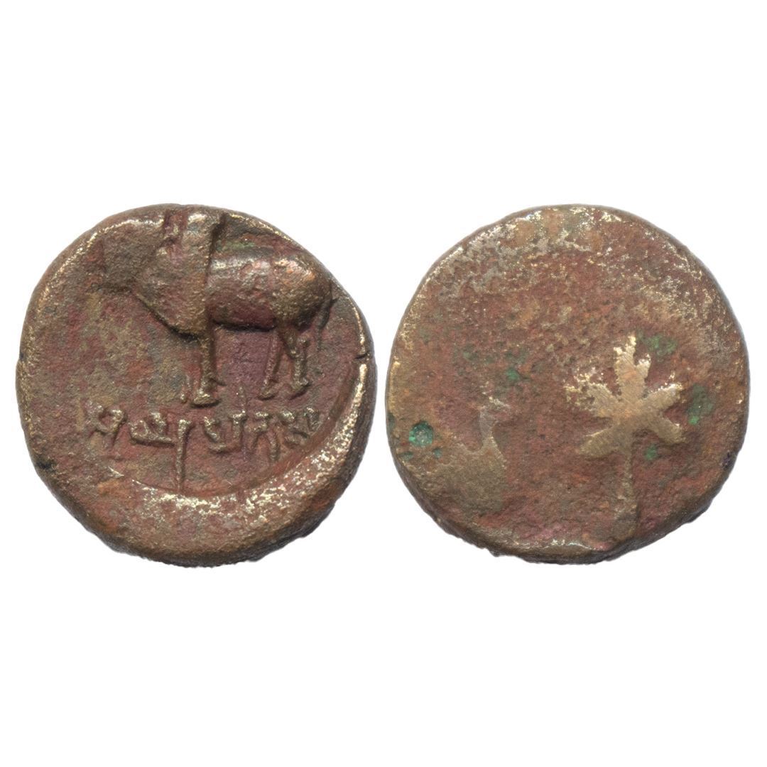 Ancient Saketa region - monarchical die-struck coinage of Ayodhya area, copper coin of Ayumitra (c.200-300 AD), PAIC 1064, 6.25g. Obv: Bull standing facing left in front of a spear; Brahmi legend Ayumitra… below. Rev: Peacock in profile to right and a palm tree.