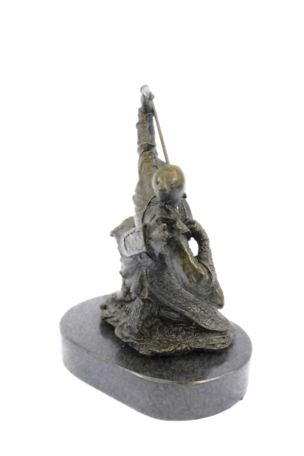 A Fierce Ancient Samurai Warrior Runs To The Front Line Of Battle. He Takes A Knee, Raises His Bow, Squints An Eye And Pulls Back. He Is Dressed In Protective Armor. A Quiver Of Bows Is Slung On His Back. His Shield And Discarded Sword Lay Beneath His Legs. The Pointy Arrow Is Parallel With His Perfect Posture. 100% Bronze And Handmade,This Brown Patina Sculpture Was Cast Using The Lost Wax Method And Mounted On A Marble Base. Bronze Dimensions With Marble Base: Height 9 X Width 7 inches. Weight: 7 Lbs.Please Note: This is a reproduction bronze sculpture from the original molded and signed. This featured bronze sculpture is a recast after the original, and has been done recently. This 100% bronze sculpture is an abstract piece certain to be a conversation piece.Please Note: This is a reproduction bronze sculpture from the original molded and signed. This featured bronze sculpture is a recast after the original, and has been done recently. This 100% bronze sculpture is an abstract piece certain to be a conversation piece.