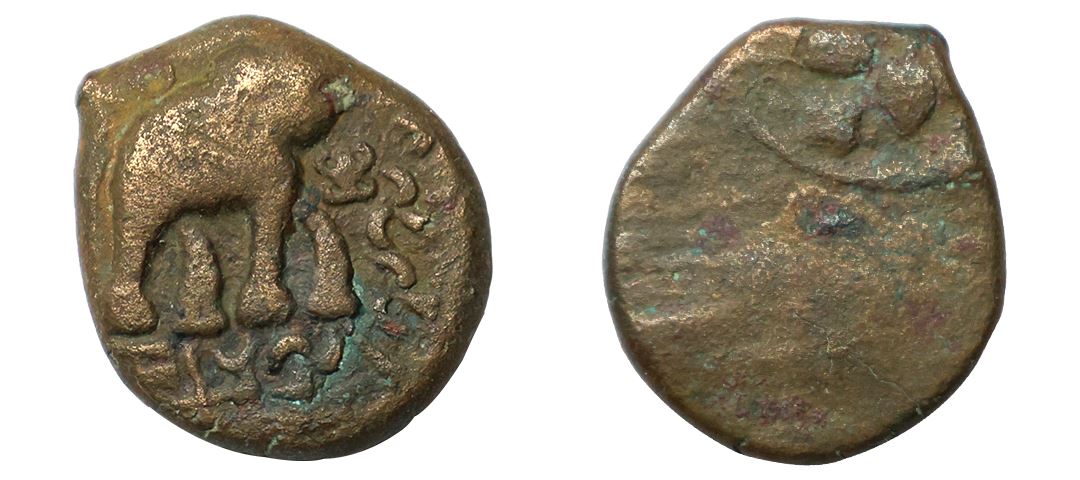 Ancient, Satavahanas, Chhimuka (2nd-1st Century BC), Copper Alloy Unit, 5.03 gms, Obv. Elephant to right with raised trunk & Srivatsa symbol in front, Rev. die shift traces of Tree visible, Pieper #2610, about very fine, rare.