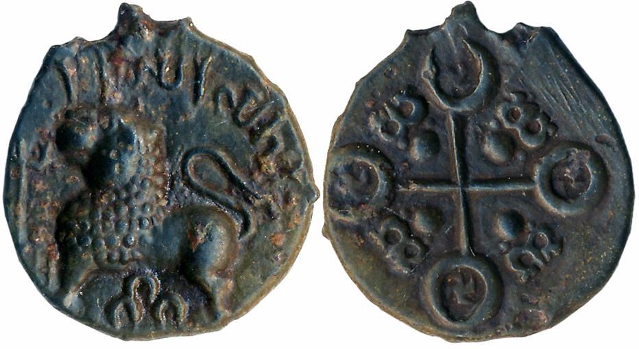 Satavahanas, Sri Satakarni, Alloyed Copper, 3.86g, "Junnar Lion" type, Obv: Lion facing left, 3 arched hills between his legs, traces of Brahmi legend, Rev: Ujjain symbol with Nandipada in 4 quadrants. Very fine, rare.