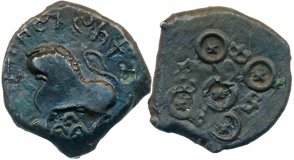Satavahanas, Sri Satakarni, Alloyed Copper, 7.27g, "Junnar Lion" type, Obv: Lion facing left, 3 arched hills between his legs, traces of Brahmi legend, Rev: Ujjain symbol with Nandipada in 4 quadrants (Mitch K&A# 114). Fine+, rare.