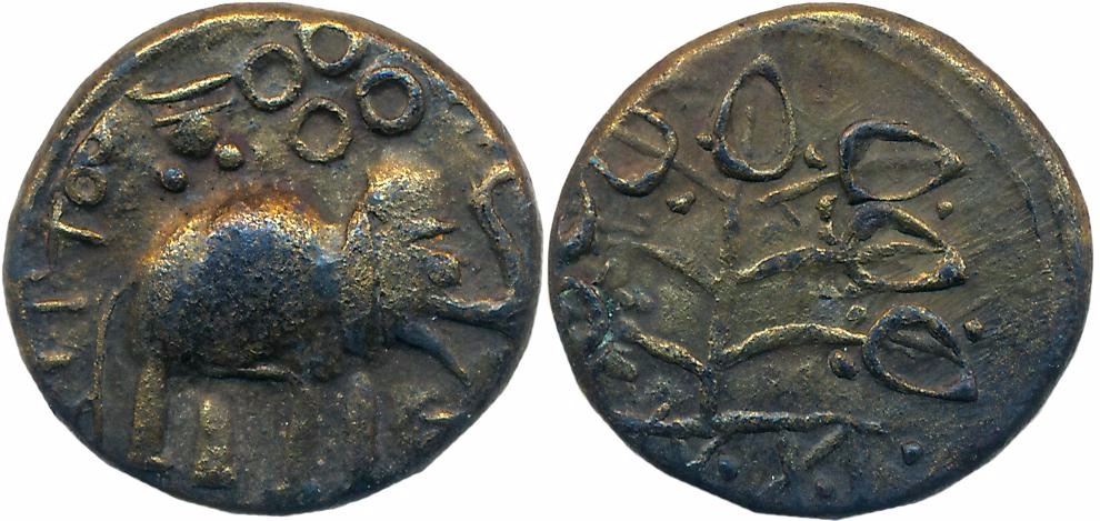 Satavahanas, Kosiki putra Satakarni, Nasik Region, Copper, 6.01g, Obv: Elephant with upraised trunk facing right in front of a Shrivatsa Symbol 4 orbs of Ujjain symbol seen on back of elephant. Brahmi legend starting from 7 o’clock ‘Rajno Kosiki (putra Statakanisa)’, Rev: Tree in railing. Very fine, rare.