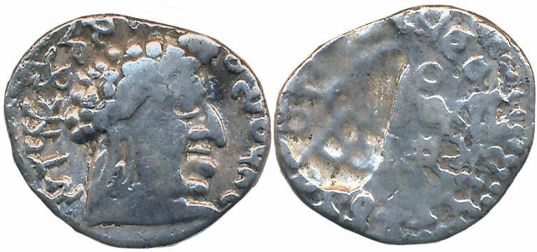 Satavahanas, Vasithiputra Siri Pulumavis, Silver Drachm, 1.93g, “Over struck”, Obv: Bust with curly long hair & prominent nose and thick lips, wearing a high head ornament, Brahmi legend around: Rano Vasithiputasa Siri Pulumavis, Rev: Four orb Ujjayini symbol, six-arched hill with a crescent, Sun and river, three arched hill overstruck faintly visible, flowing below, Southern Brahmi - Tamil-Telugu / Prakrit legends around could be read as Arahanaku Vahitti Makanaku Hiru Pulumaviku(Mitch K&A# 153). Interesting, very fine, rare.
