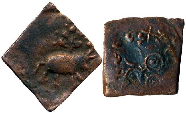 Satavahanas, Siri Satakarni, Elephant type, Copper, 4.20g, Obv: Elephant walking to right with upraised trunk, tree above, Rev: Four orb Ujjaini symbol with dot in center, Brahmi legend “Rajno Siri (sata)kanisa”. Very fine+, very rare.