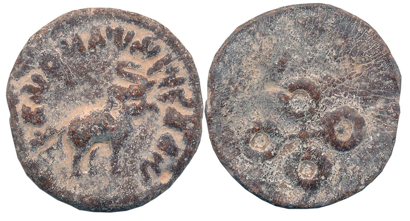 Satavahanas, West Maharashtra Vasithiputa Siri Pulumavi, Lead, 10.04g, “Wategaon Hoard” type, Obv: Elephant facing right with trunk raised, Brahmi legend “Raño Vasithiputasa Siri Pulumavisa” around, Rev: “Ujjain” symbol modified with a crescent. Extremely fine, extremely rare.