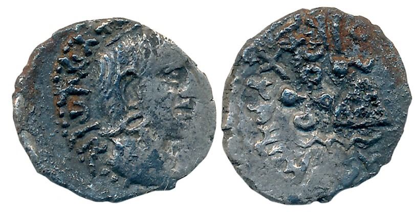 Satavahanas, Gotamiputa Siri Yajna Satakani, Silver Drachm, 1.79g, “Portrait Roman Head” type, Obv: Profile bust of the ruler, with short concentric head of hair (commonly known as the ‘Roman Head’) with head-ornament or Choodamani; Brahmi legend “…Satakanisa” around, Rev: Satavahana dynastic emblem in the centre, Southern Brahmi legend “Arahanaku… Hatakaniku” around. Very fine, very rare.