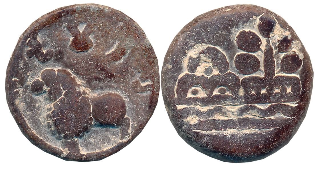 Satavahanas Feudatories, Kumaras Isamula, Lead, 10.38g, Rev: Lion facing left with upraised tail, Complete Brahmi legend “Kumara Isamulas” above, Rev: Railed tree, three arched hill on left and river line below (Piper# 2017). Extremely fine for type, very rare.