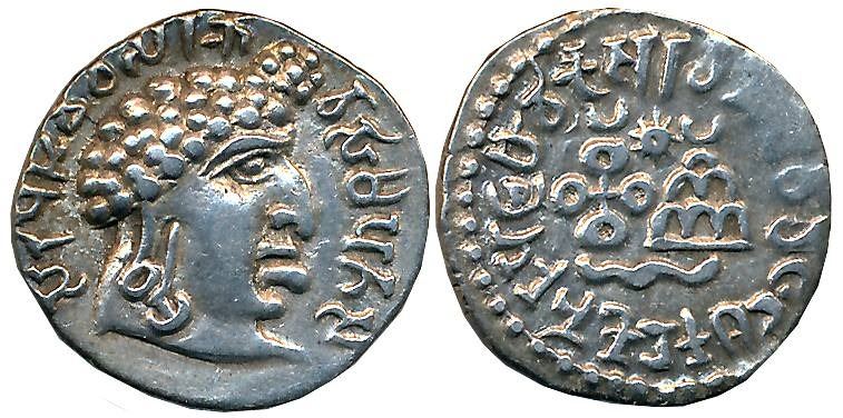 Satavahanas, Vasithiputa Siri Pulumavi, Silver Drachm, 1.94g, “Portrait” type, Obv: Bust of king in profile to right, with curly hair, forehead jewel and heavy ear-ornaments; Brahmi legend “Raño Vasithiputasa Siri Pulumavisa” around, Rev: Satavahana dynastic emblem composed of six-arched hill topped by crescent, modified 'Ujjain' symbol, wavy line, sun and crescent moon; Southern Brahmi legend “Arahanaku Vahittimakanaku Tiru Pulumaviku” around (MCSI 146). A handsome specimen with complete legends on both sides. About extremely fine.