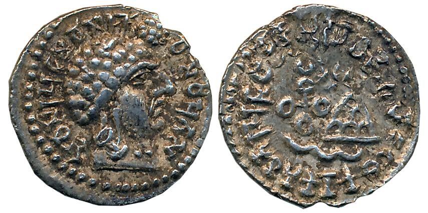 Satavahanas, Vasithiputa Siva Siri Pulumavi, Silver Drachm, 1.87g. “Portrait” type, Obv: Curly-haired bust of the king facing right, with jewel on the forehead, sporting a small moustache and a line of thin facial hair along the cheeks, with heavy ear-plugs; Brahmi legend “Raño Vasithiputasa Siva Siri Pulumavisa” around, Rev: Dynastic emblem composed of modified 'Ujjain' symbol six-arched hill with crescent, Sun and wavy line in the centre; legend in Southern Brahmi “Arahanaku Vahittimakanaku Tiru Tiva Pudumaviku” around. Extremely fine, extremely rare.