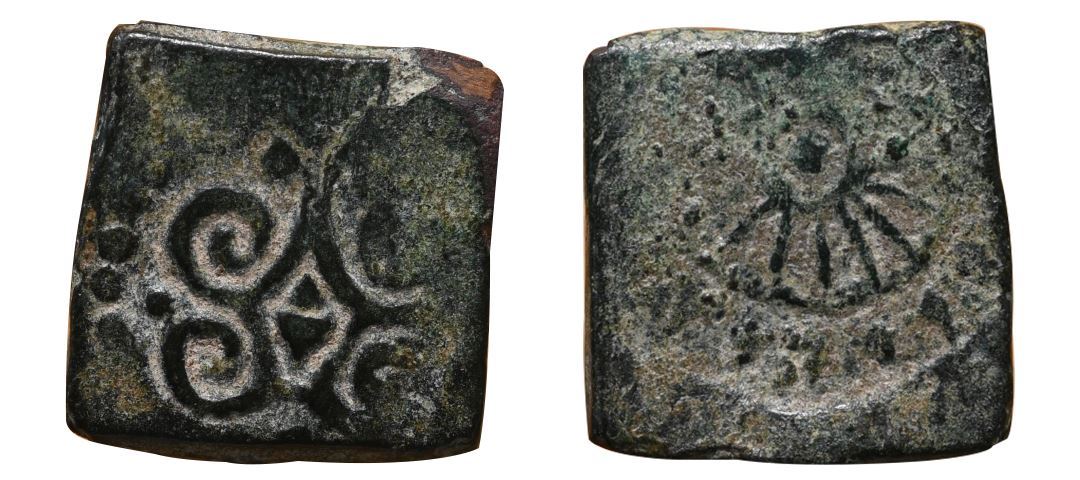 Ancient Saurashtra (100 BC), Copper, 2.61g, uninscribed, Obv: Decorated Shrivatsa symbol. Rev: a decorated wheel. Very Fine for the type, Scare.