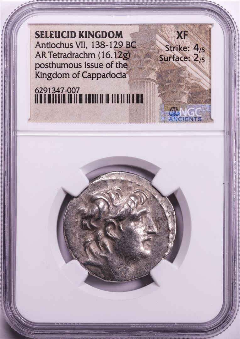 One Ancient Seleucid Kingdom 138-129 BC Antiochus VII Tetradrachm Cappadocia Coin NGC XF. NGC Certified.