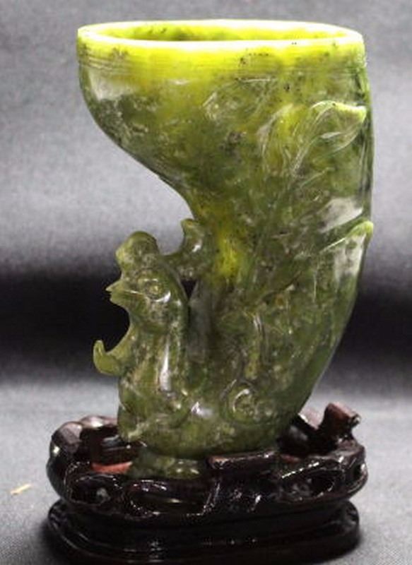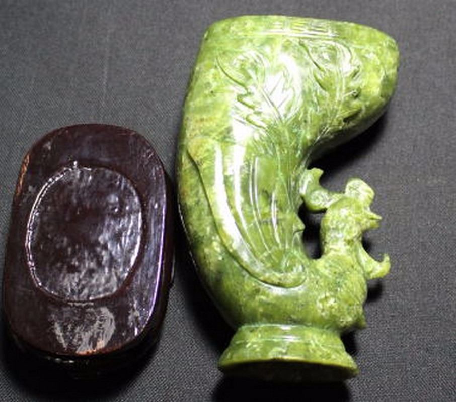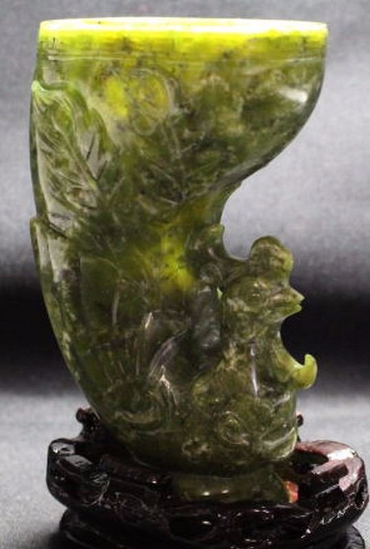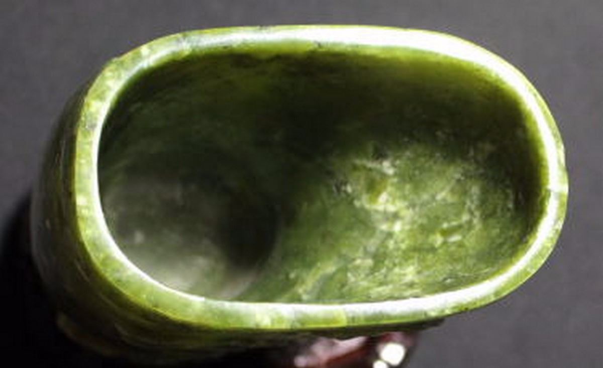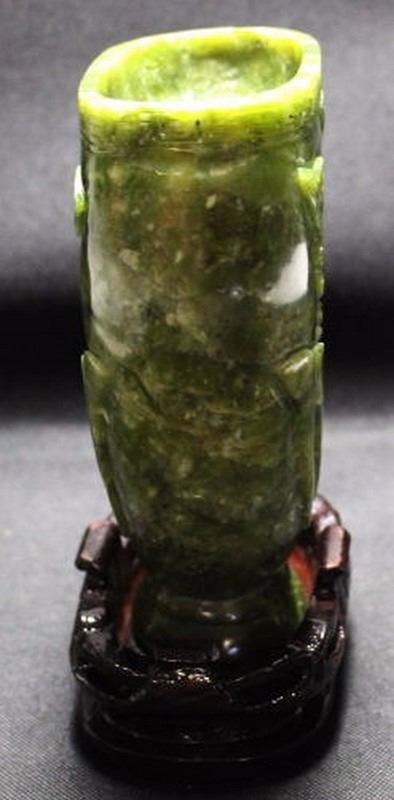 Ancient Solid Spinach Jade Sculpture of Bird Vase w/ Stand 6x4"