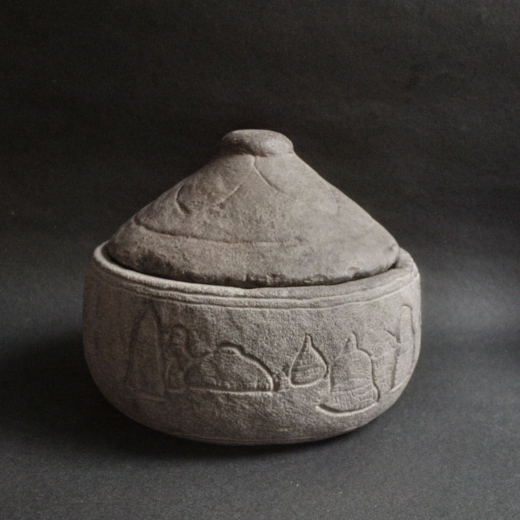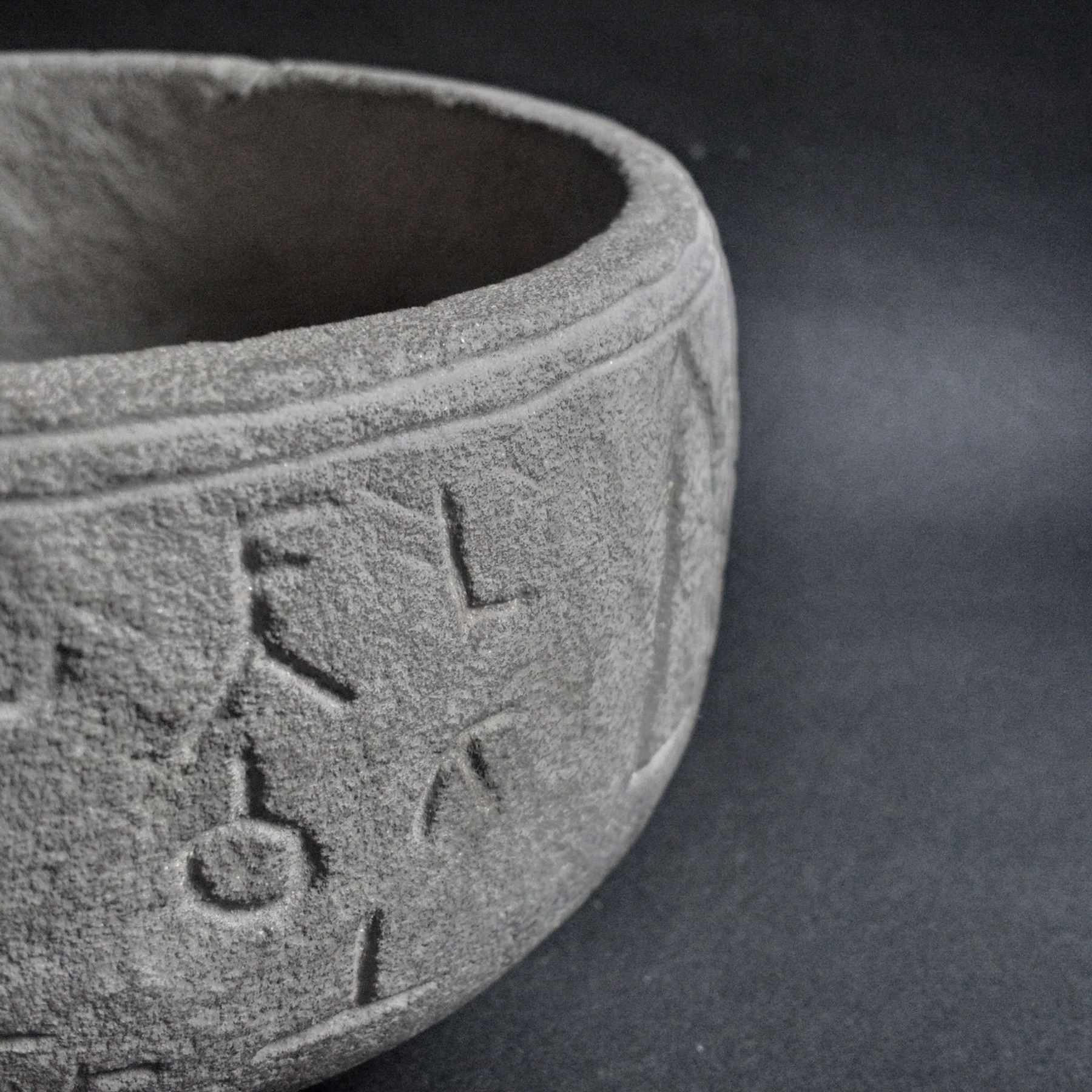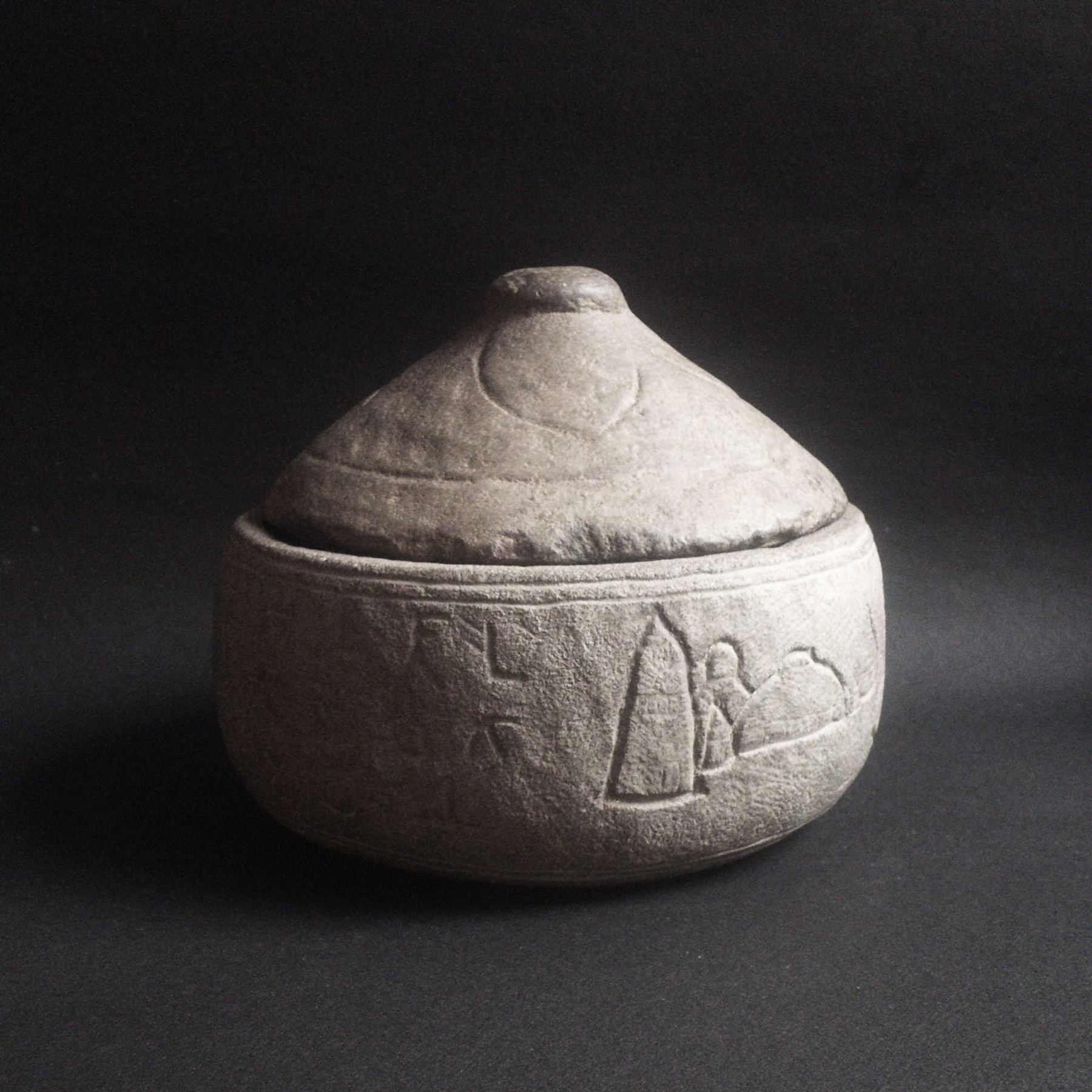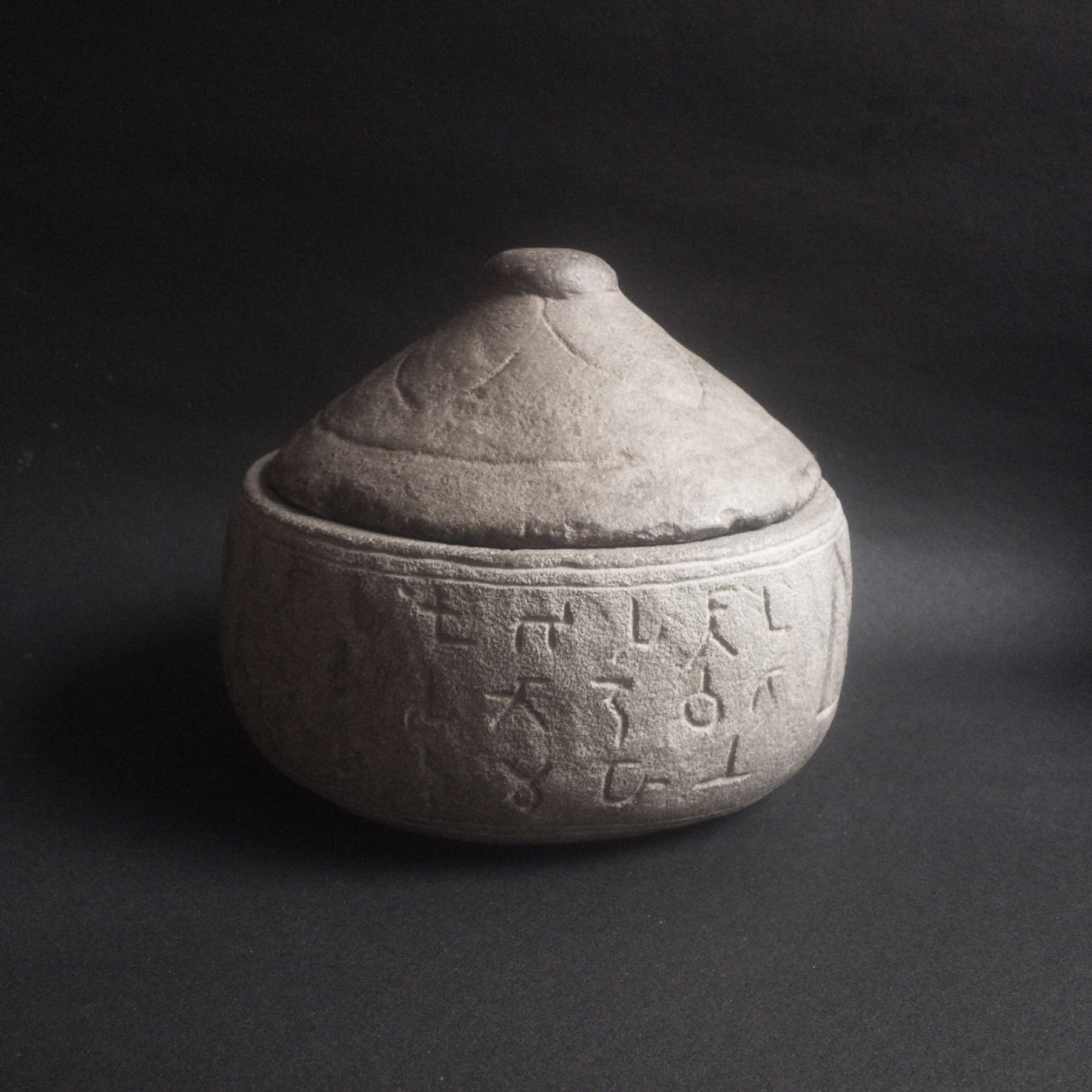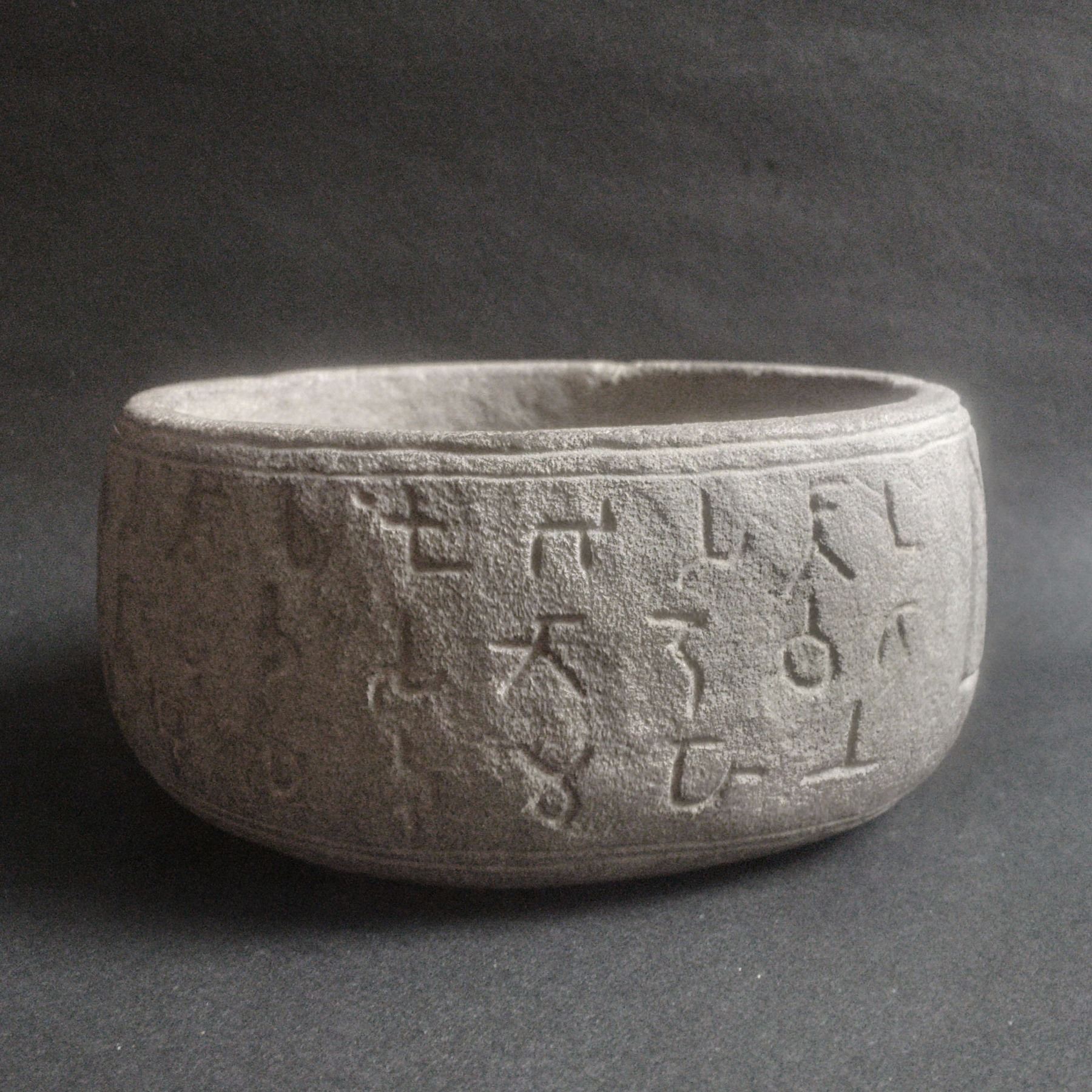 This ancient stone bowl is dating to the 2nd -3rd Century, was unearthed in Asia, Northern India. This is one of the first and the earliest examples of Brahmi Script on a vessel ever found in India especially when they can be deciphered and read. Brahmi script is one of the oldest writing systems used in Ancient India and present South and Central Asia from the 1st millennium BCE. There are also a series of strange carvings on the outer surface of the bowl which depicts Ancient Vim?na's / Flying Crafts. A vimana is a word with several meanings ranging from temple or palace to mythological flying machines described in Sanskrit epics. References to these flying machines are commonplace in ancient Indian texts, even describing their use in warfare. Dimension: 154 mm. x 71 mm. x 8 mm. (Without Lid) 154 mm. x 126 mm. x 8 mm. (With Lid)