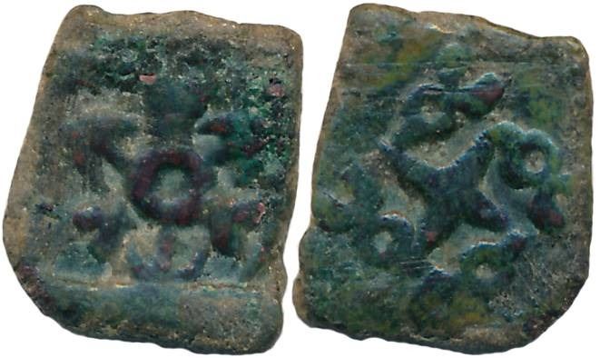 Taxila, Local coinages, Copper, 2.31g, Obv: Six armed symbol, Rev: Swastika with orbs with each corner. Very fine.