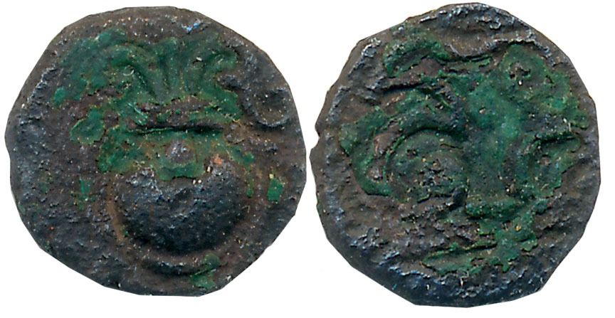 Guptas, Chandra Gupta II, Copper, 0.53g, “Kalash” type, Obv: Kalasha, Rev: Brahmi legend “Chandra” (Pieper# 3552). Very fine for type, rare.