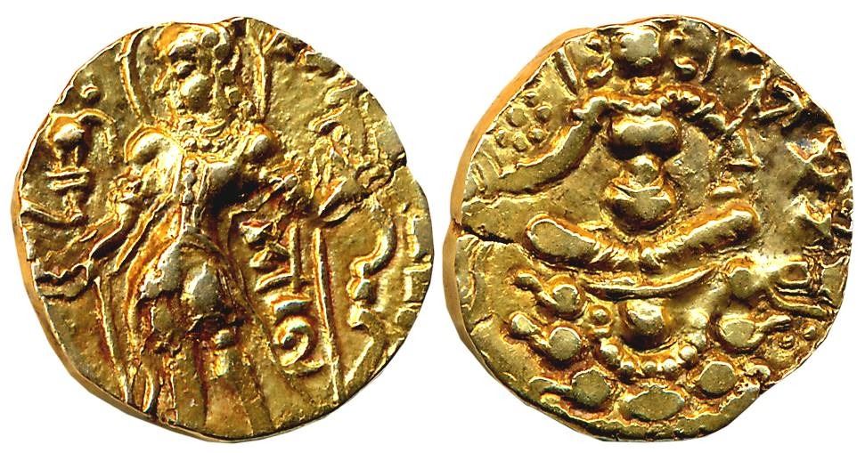 Guptas, Skanda Gupta, Gold Dinar, 9.17g, “Archer- Sankhanidhi” type, Obv: Nimbate figure of standing king, holding strung bow in right and an arrow in the left, Garuda standard, with ribbons attached to the staff in the background, Brahmi legend “Jayati…..” around, Rev: Nimbate Godess Lakshmi seated cross legged on bloom lotus, holding lotus flower in one hand and diadem in the other, Sankhanidhi symbol with pearls flowing out is on reverse in the upper top left quadrant, Brahmi legend “Kramadityah” to right (S Kumar# Class I, Var.C). Very fine+, rare.