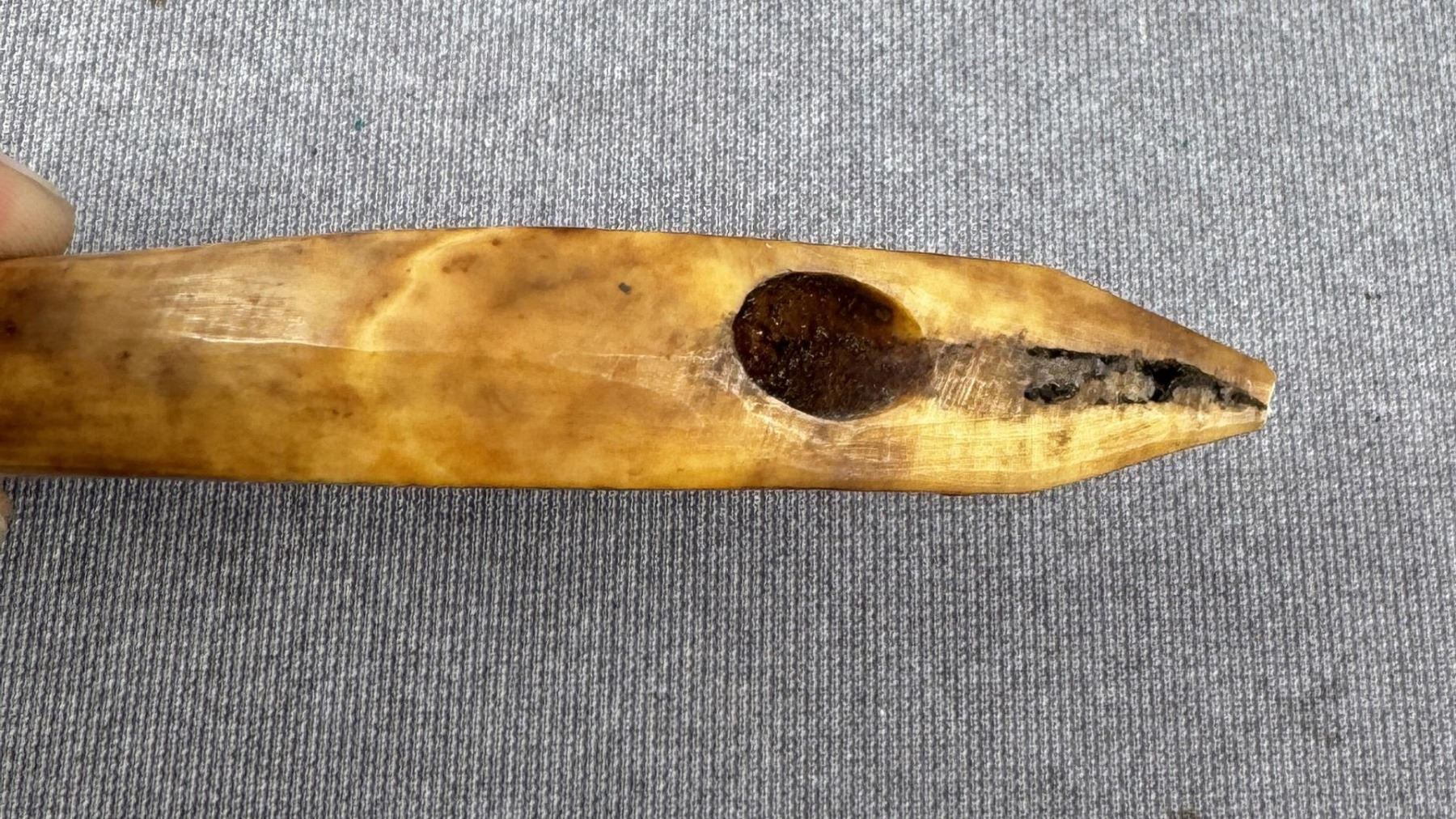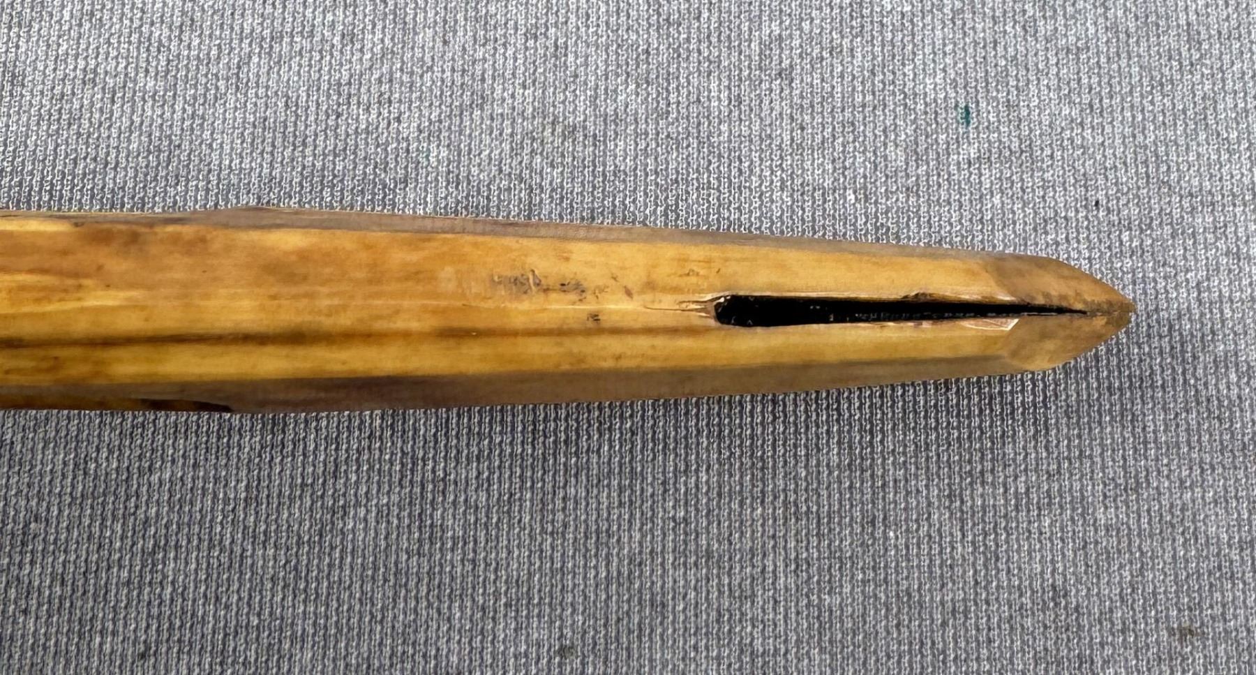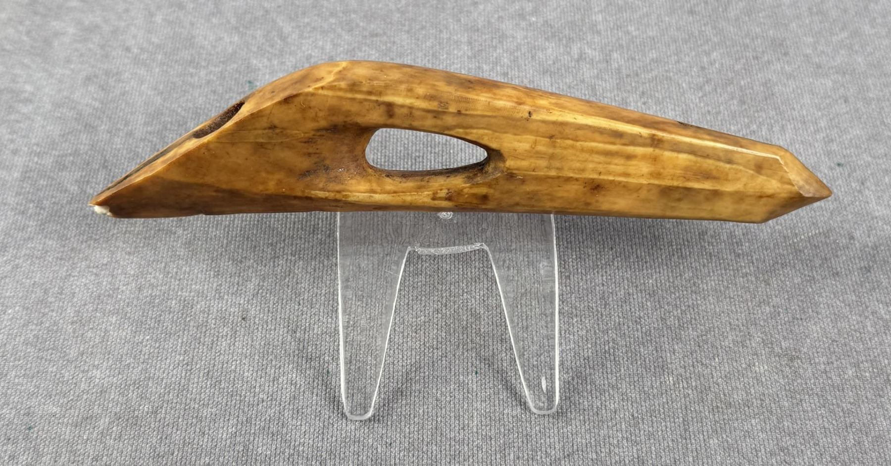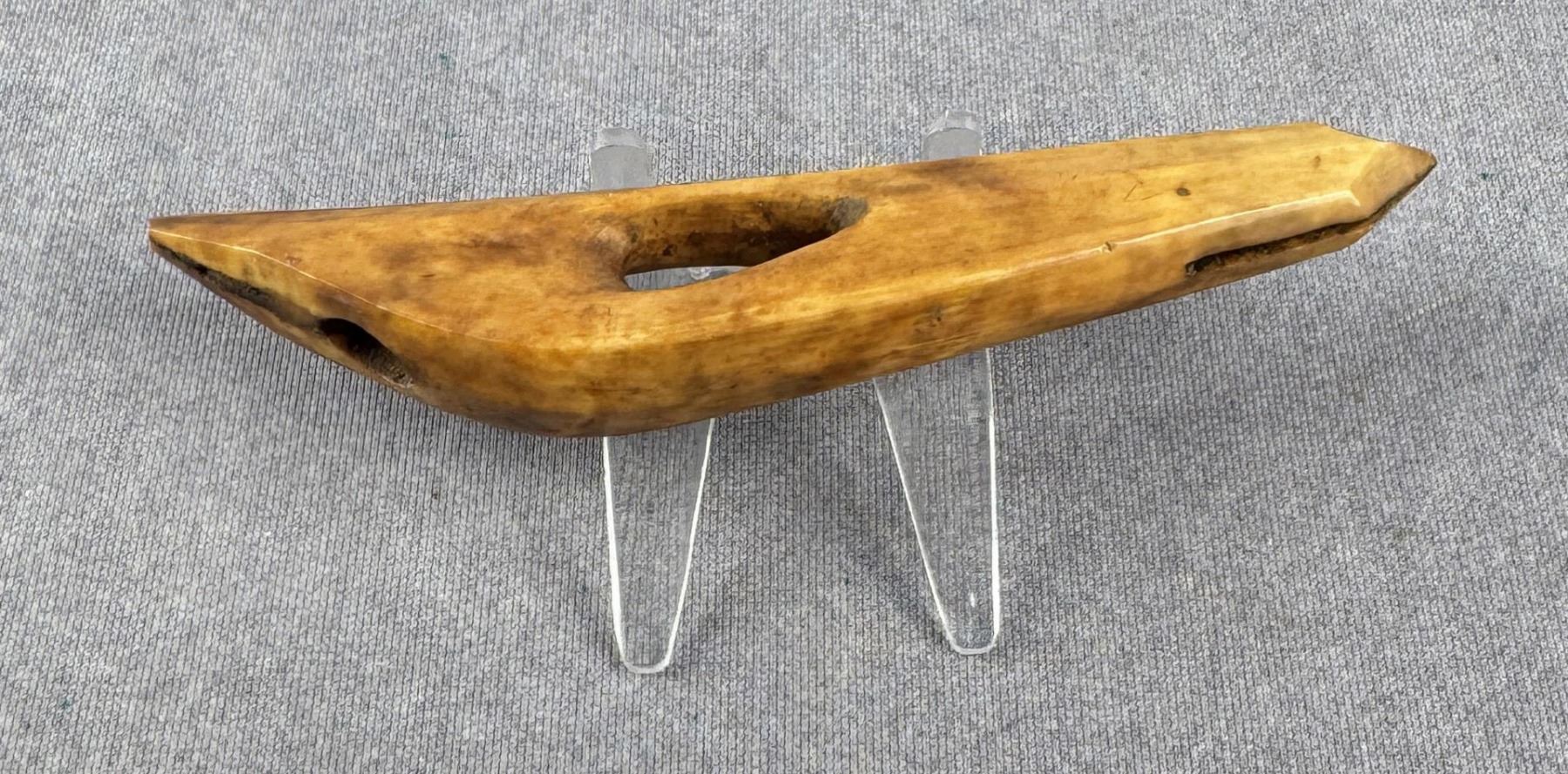 5 3/4" long. Carved walrus material. Native made prior to 1972. This item cannot be shipped to Oregon, California, Hawaii, New York, New Jersey, Internationally, or any other state that prohibits.