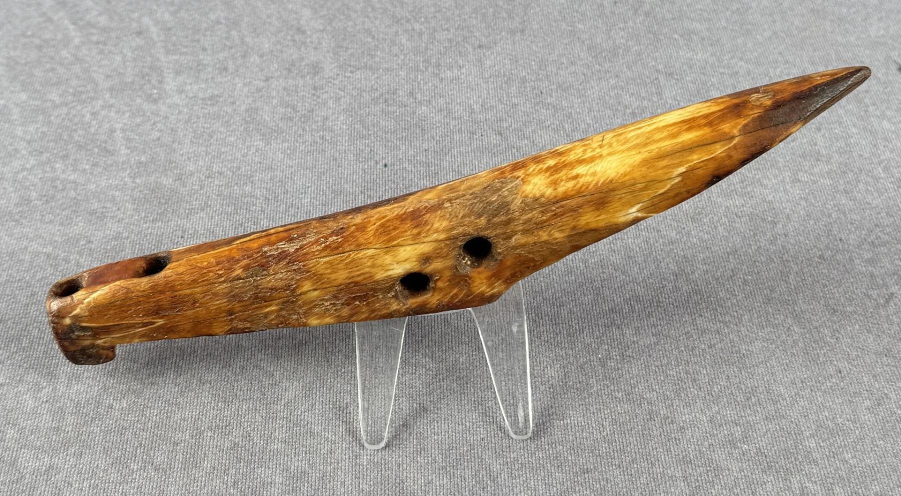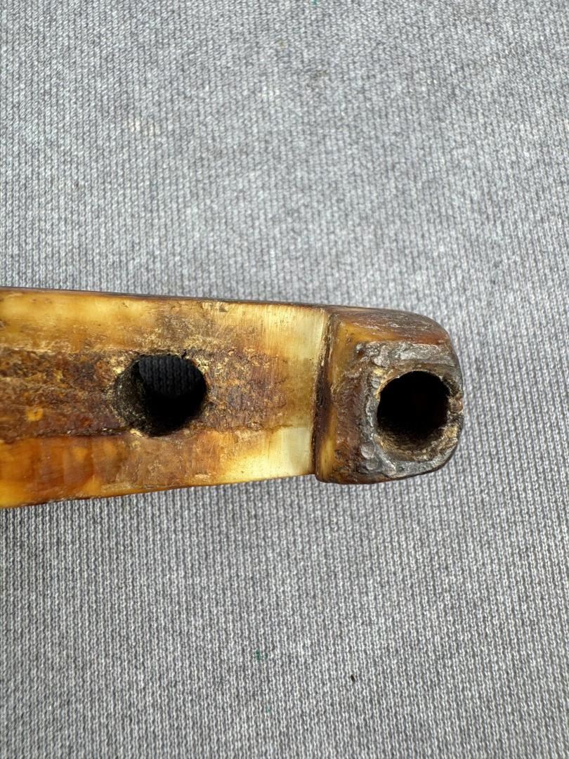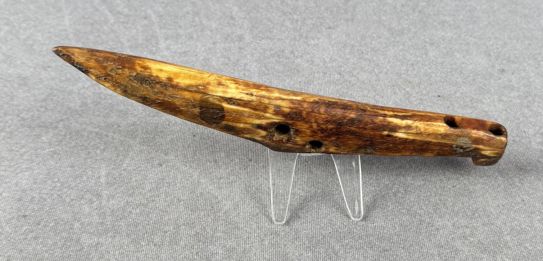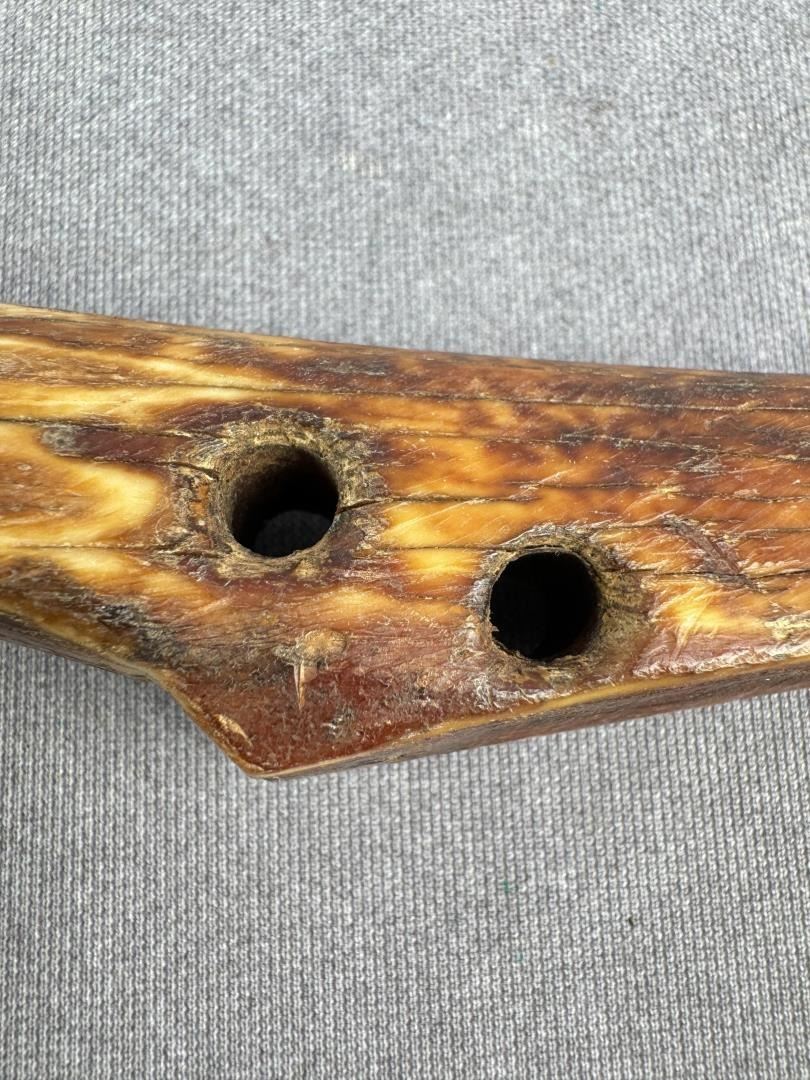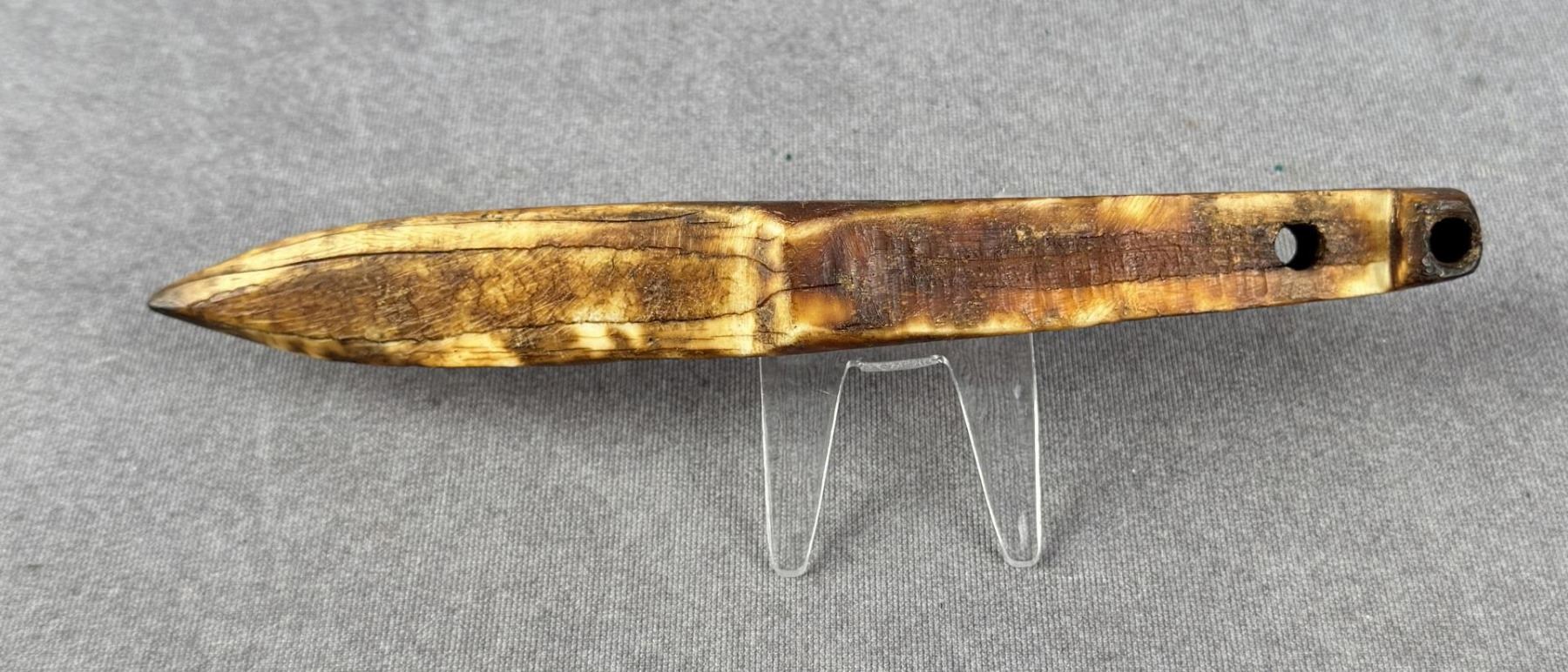 8 1/4" long. Huge point, more than likely for whale. Carved walrus material. Native made prior to 1972. This item cannot be shipped to Oregon, California, Hawaii, New York, New Jersey, Internationally, or any other state that prohibits.