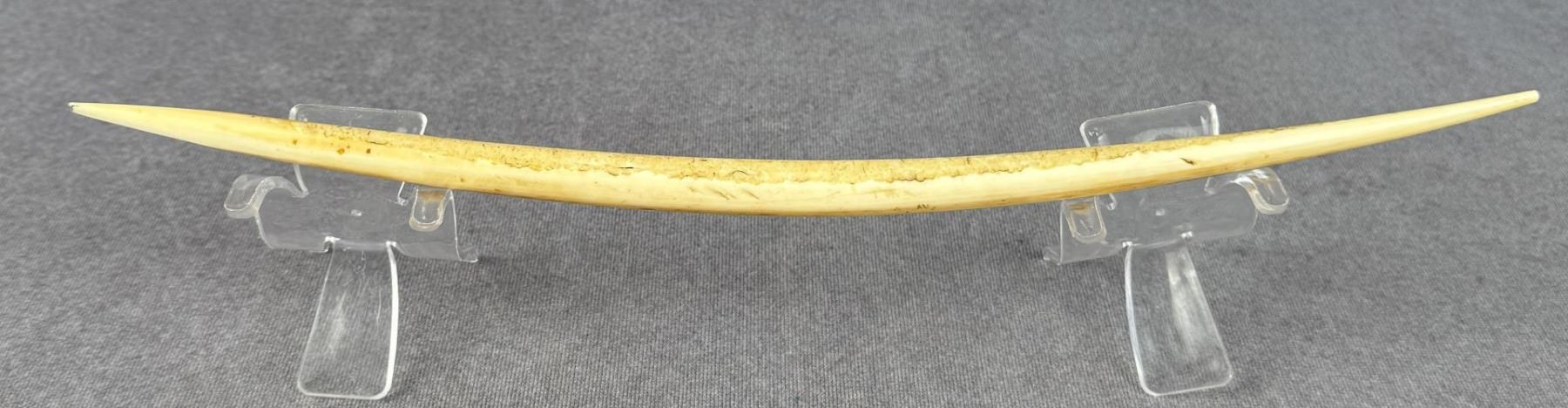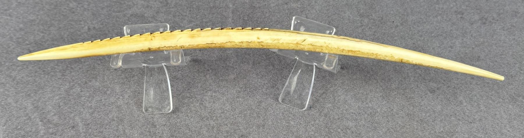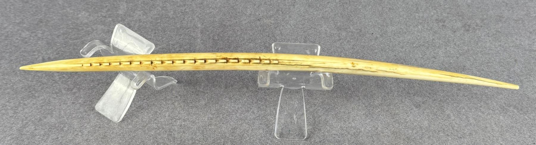 12" long. Large size, more than likely for whales, barbed. Carved walrus material. Native made prior to 1972. This item cannot be shipped to Oregon, California, Hawaii, New York, New Jersey, Internationally, or any other state that prohibits.
