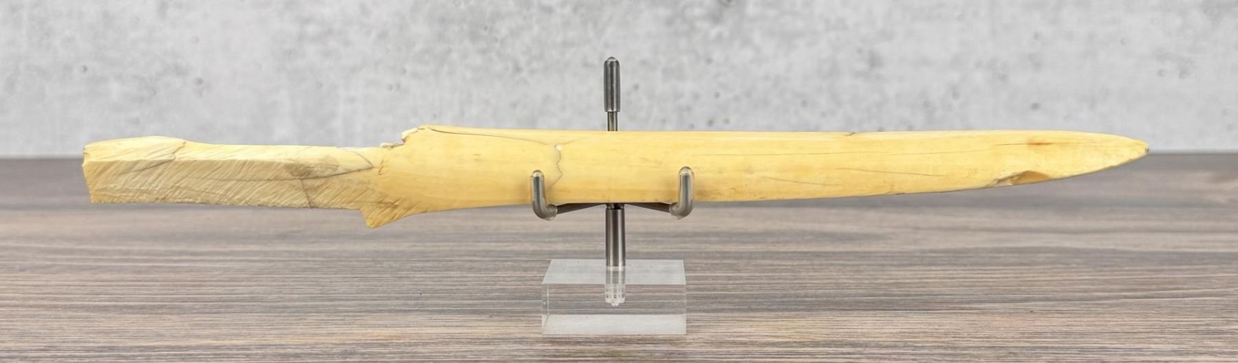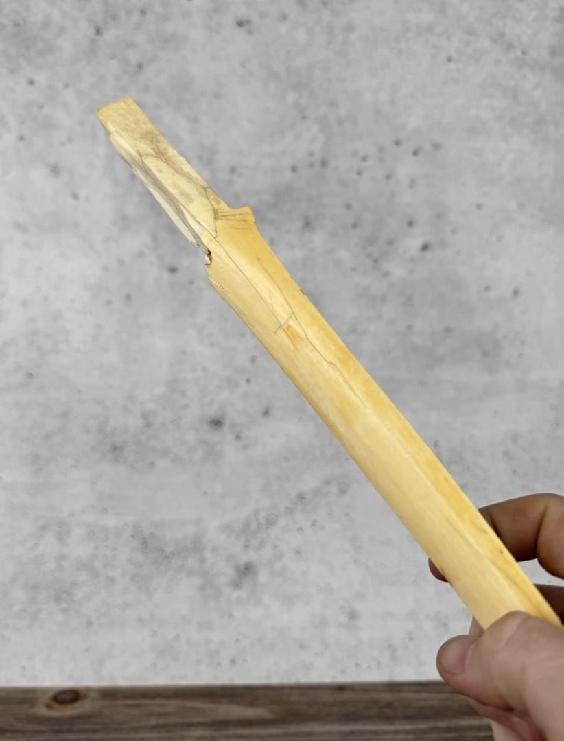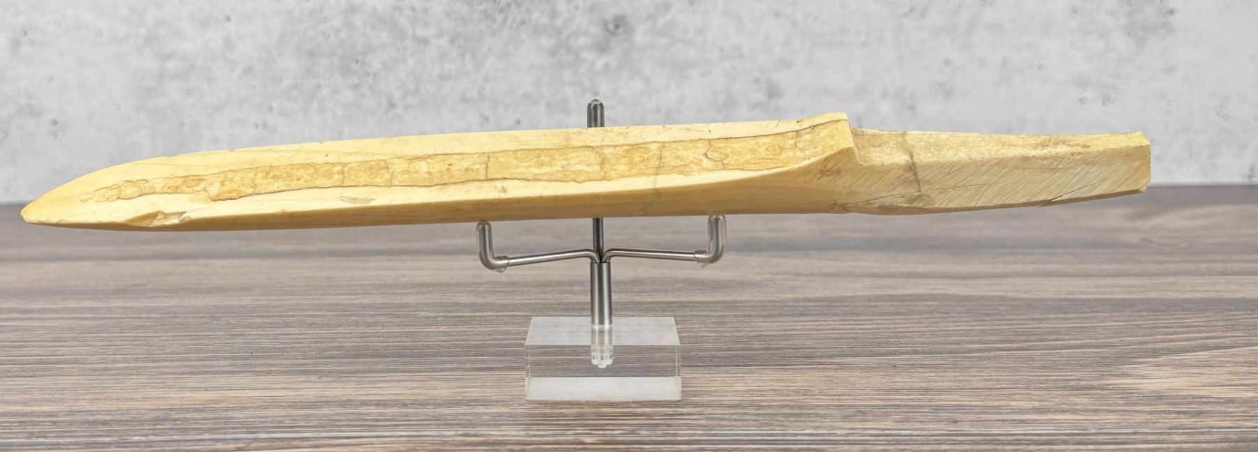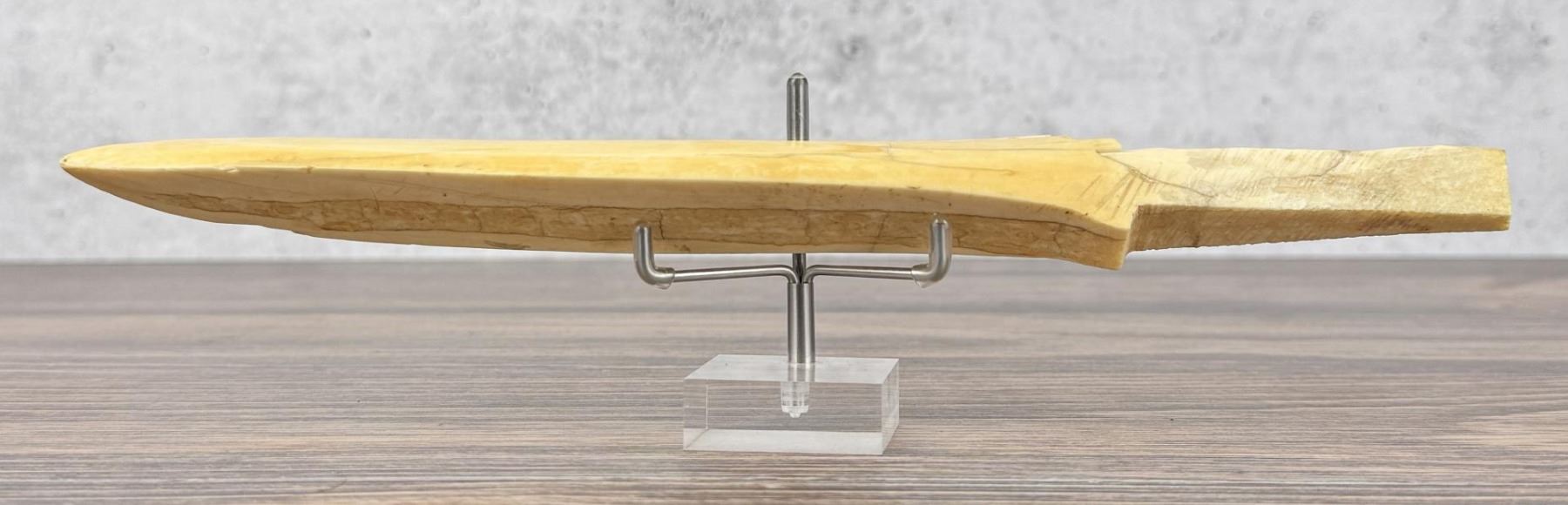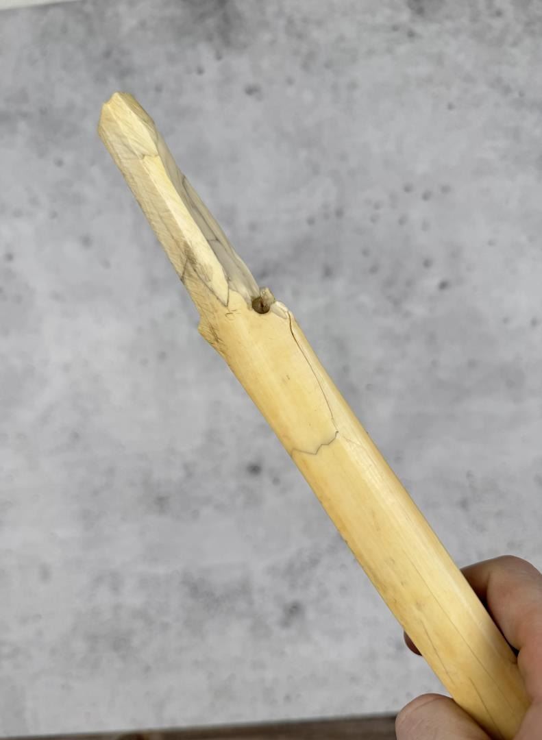11 7/8" long. Carved walrus material. Native made prior to 1972. This item cannot be shipped to Oregon, California, Hawaii, New York, New Jersey, Internationally, or any other state that prohibits.