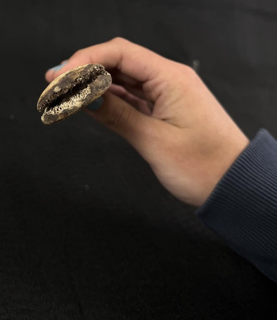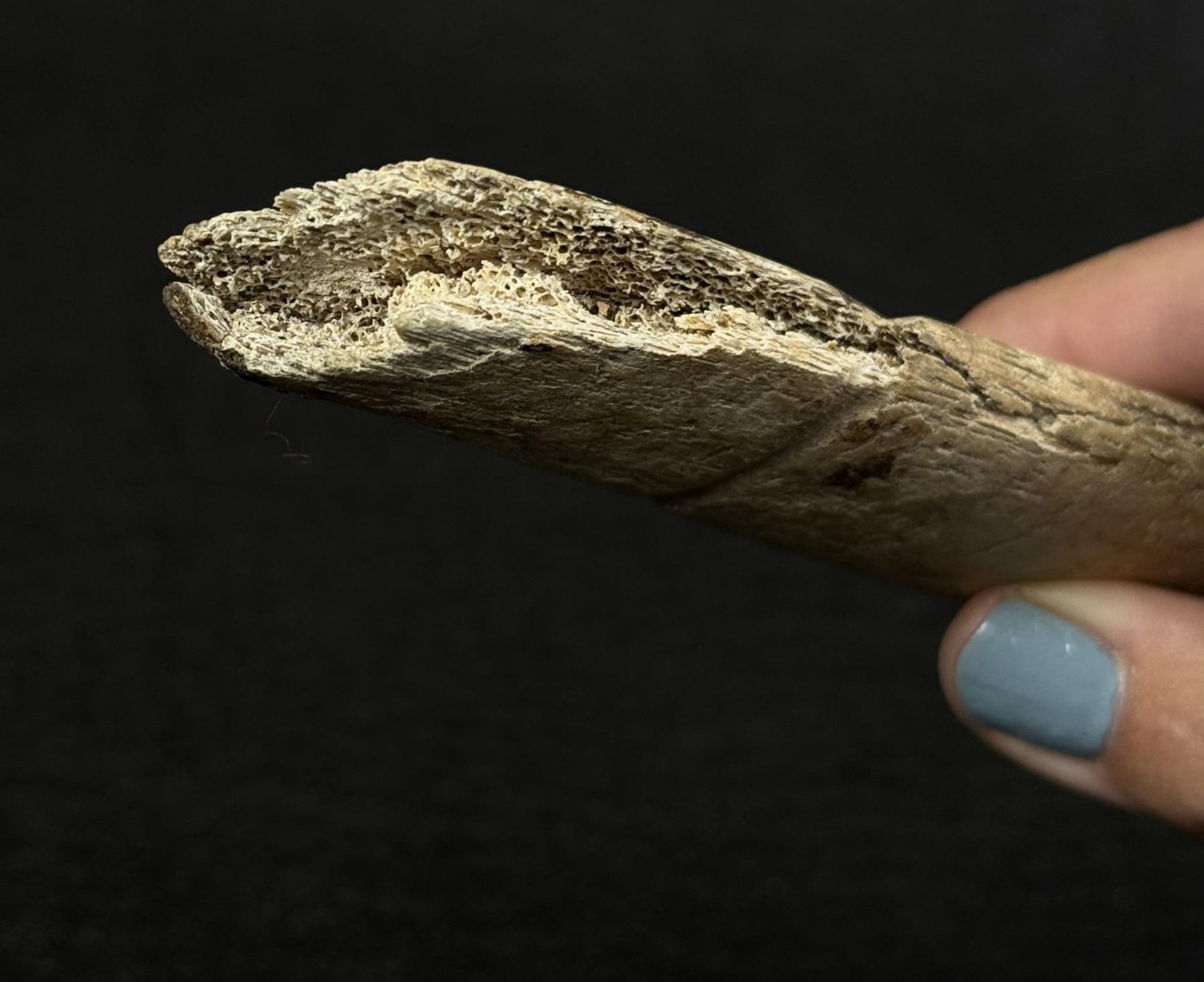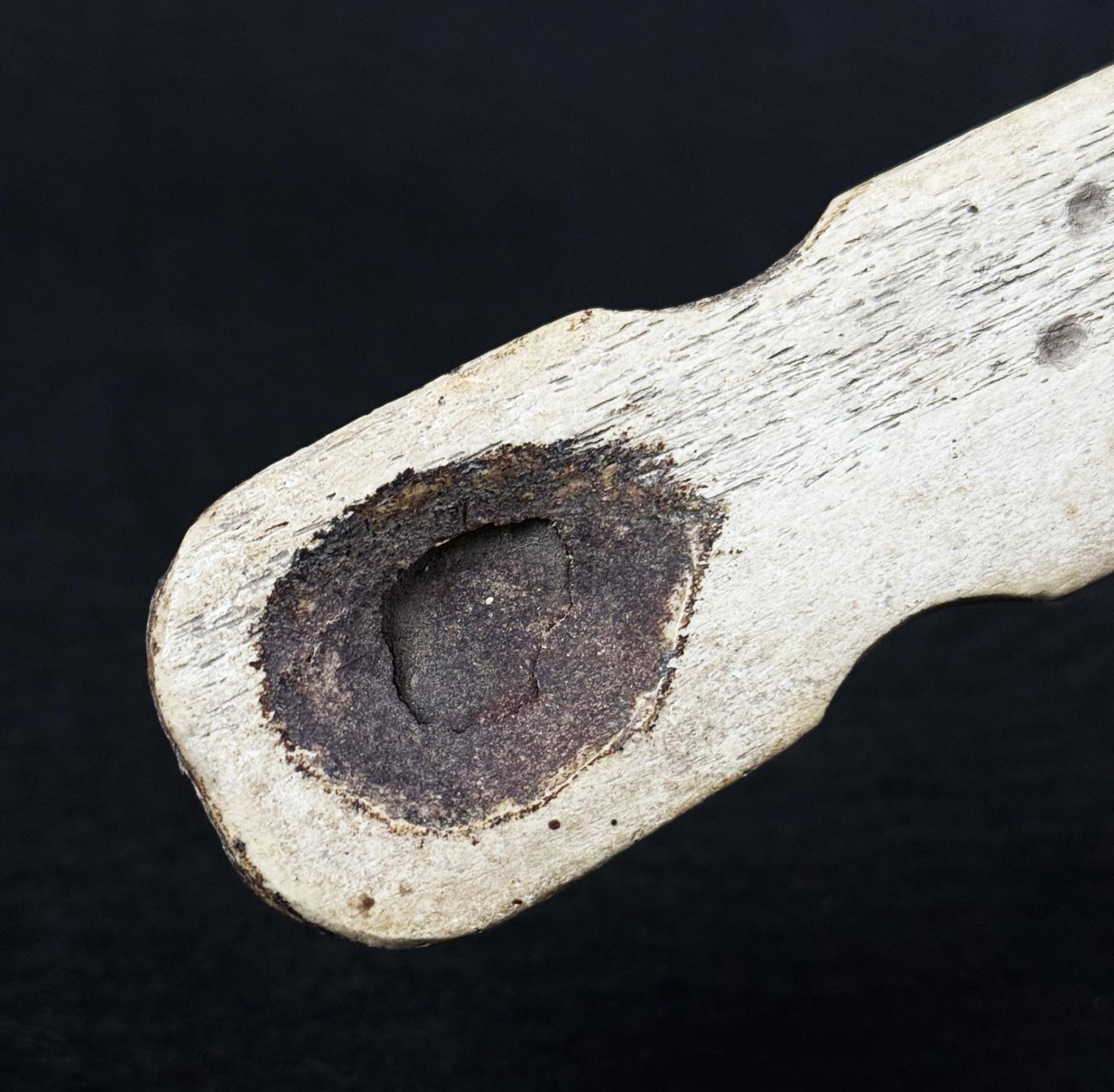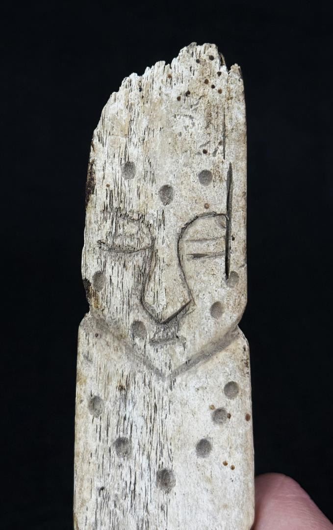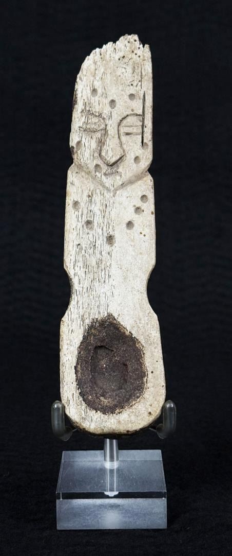 Wonderful early piece carved with a human effigy handle. 6 1/8" long.