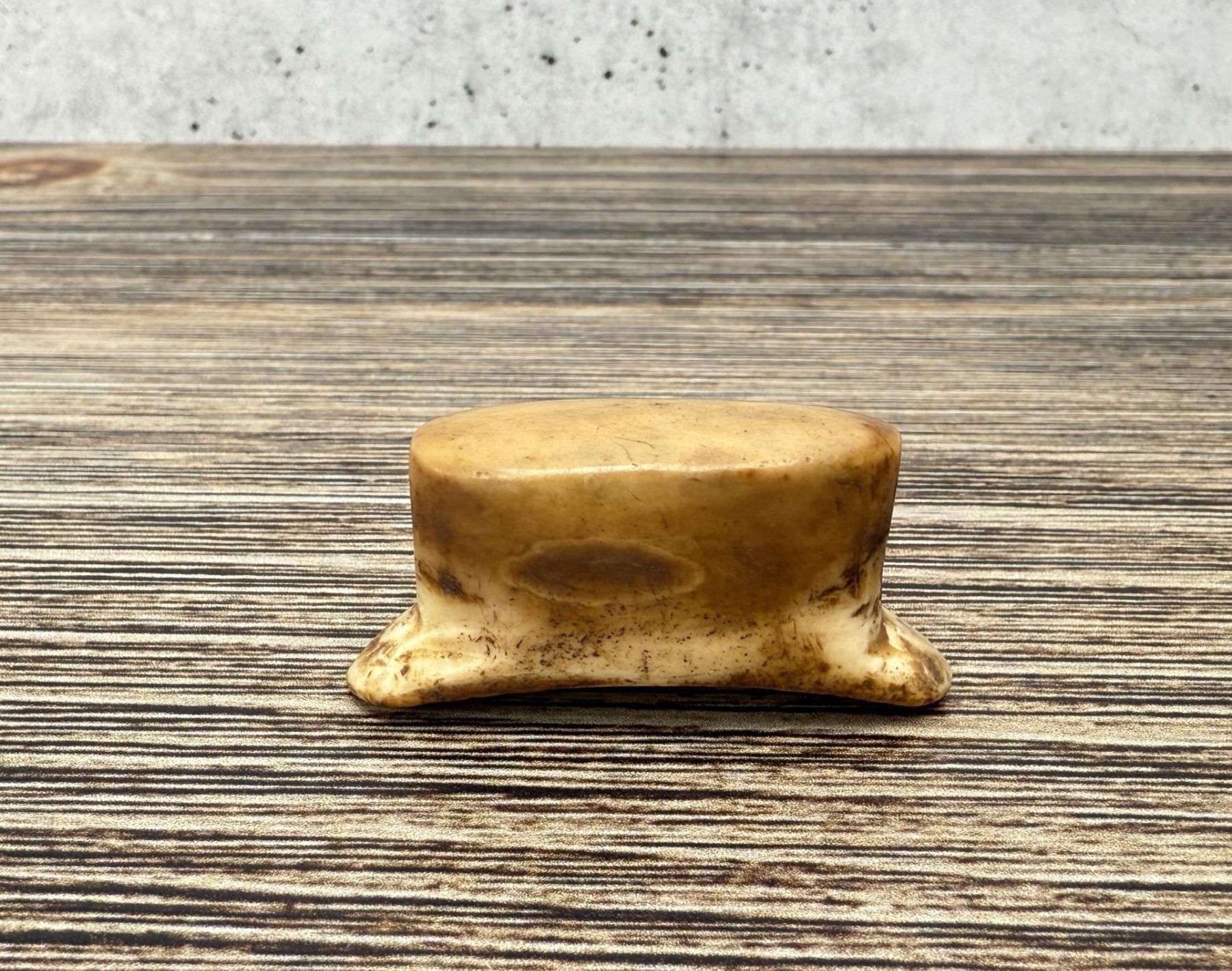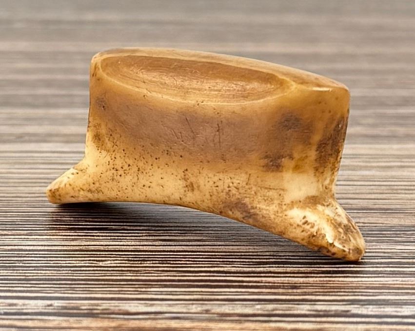 1 5/8" by 3/4" by 1/2". Carved walrus material. Native made prior to 1972. This item cannot be shipped to Oregon, California, Hawaii, New York, New Jersey, Internationally, or any other state that prohibits.