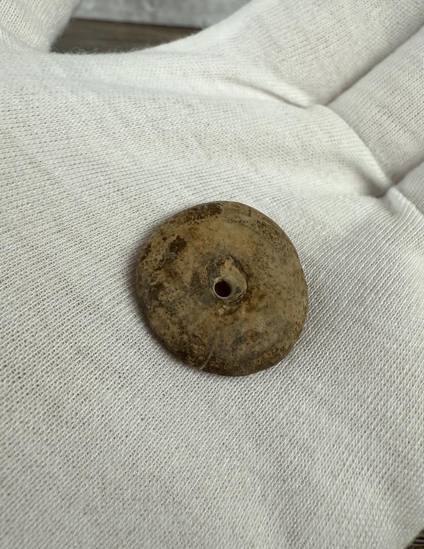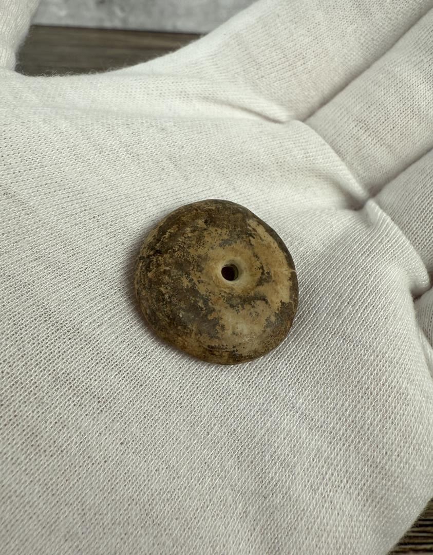 1" by 7/8" by 1/4". Carved walrus material. Native made prior to 1972. This item cannot be shipped to Oregon, California, Hawaii, New York, New Jersey, Internationally, or any other state that prohibits.