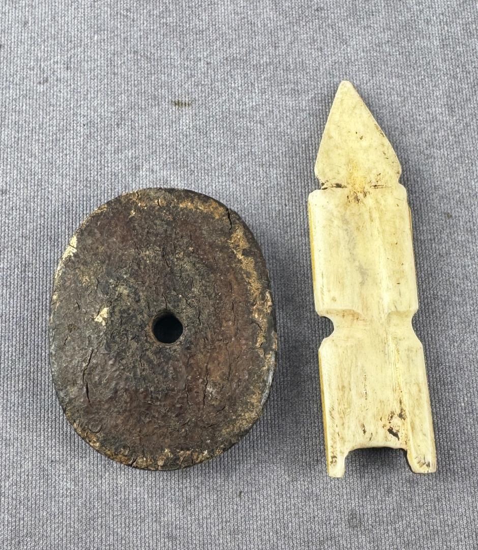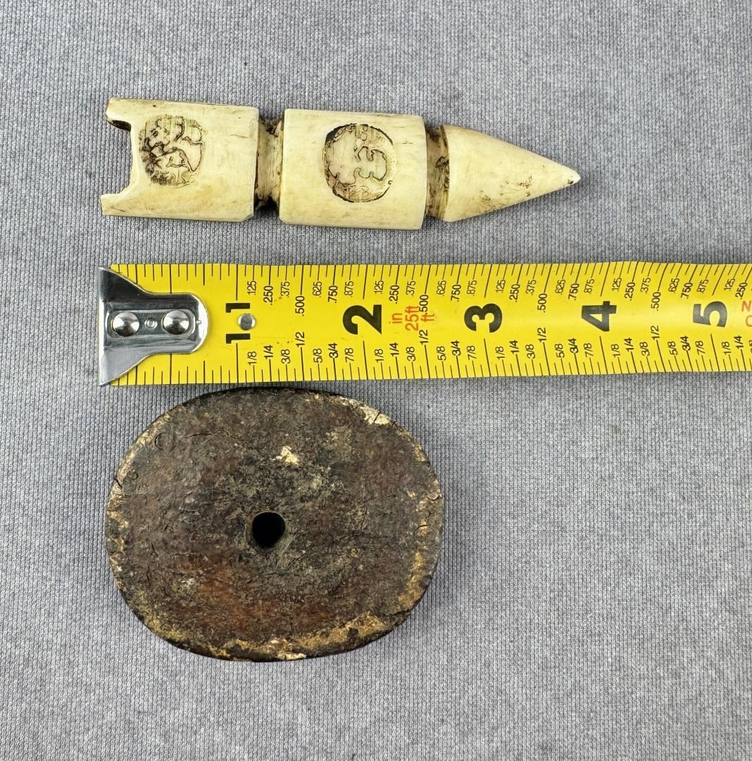 Also includes a shuttle. Carved walrus material. Native made prior to 1972. This item cannot be shipped to Oregon, California, Hawaii, New York, New Jersey, Internationally, or any other state that prohibits.