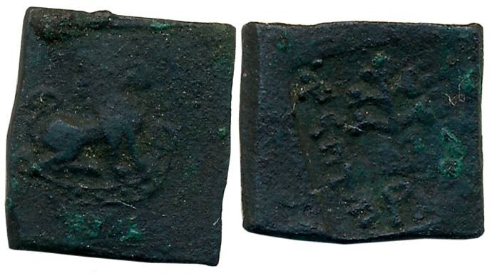 Tribal Republic, Agras of Agrodaka (Agroha) region, Copper, 2.25g, “Lion” type, Obv: Railed tree with Brahmi legend around, Rev: Lion facing right (Pieper# 994). Very fine, rare.