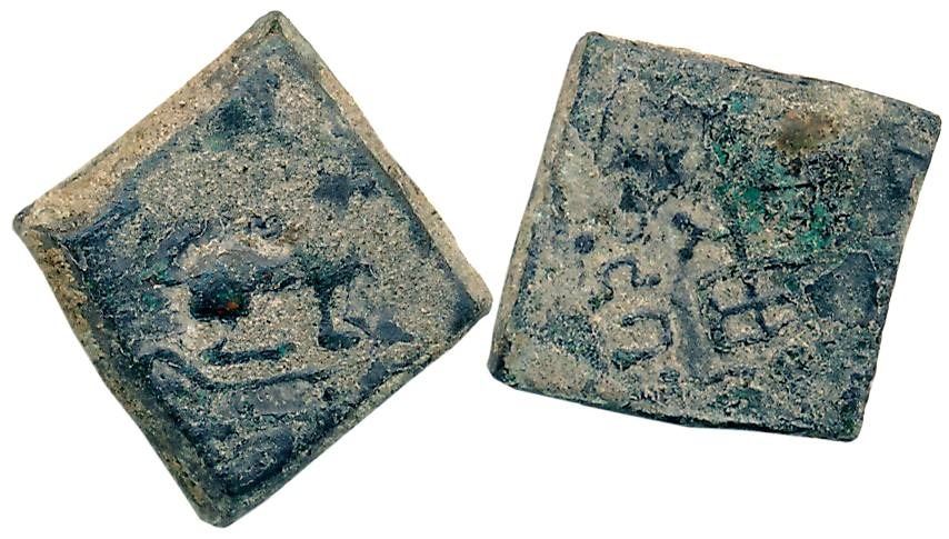 Tribal Republic, Agras of Agrodaka (Agroha) region, Copper, 3.03g, “Lion” type, Obv: Railed tree with Brahmi legend around, Rev: Lion facing right (Pieper# 992). Patinated, very fine, very rare.