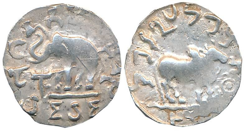 Tribal Monarchies, Audumbaras, Mahadeva, Silver Drachm, 2.24g, Obv: Elephant on bottom line to left, parasol in uplifted trunk, trident-axe on left, Brahmi legend “Bhagavata Mahadevasa Rajarajna” (Rajaraja in exergue), Rev: Humped Bull to right on wavy bottom line, Lotus on right, Kharosthi legend “Bhagavata Mahadevasa Rajarajna”. Extremely fine for type, extremely rare.