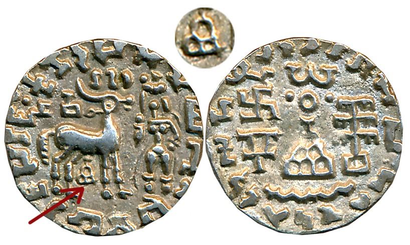 Tribal Monarchies, Kunindas, Amoghabhuti, Silver Drachm, 2.02g, Obv: Goddess standing, holding Lotus, a Deer to her left, three arched chitya with parsol above, below the Deer’s belly, Shrivatsa between horns and altar above rump, Brahmi legend “Rajñah Kunindasa Amoghabhutisa Maharajasa” around (tops of some letters off flan), Rev: Composite symbol of six arched hill, wavy line, Nandipada, Swastika, triangle-headed standard-Shrivatsa and tree in railing, Kharosthi legend “Raña Kunidasa Amoghabhutisa Maharajasa” around, partly visible (PAIC# 1200). Extremely fine, rare.