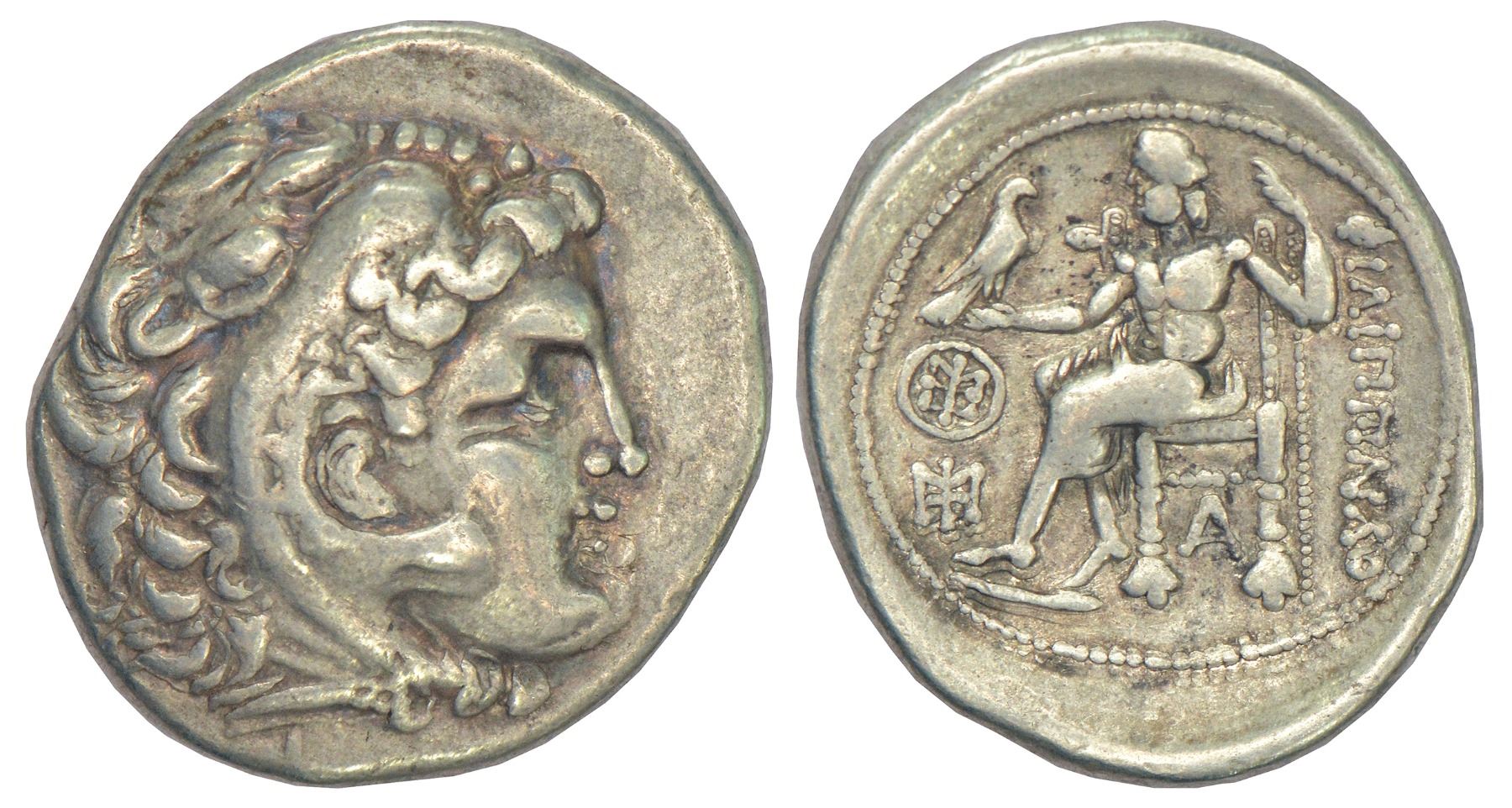 Celtic tribes of lower Danube region - imitative silver tetradrachm of Philip III Arrhidaios, King of Macedon (323-317 BC) Arados mint, cf. Price-P152, 16.82g. Obv: Head of Heracles right, clad in lion's skin. Rev: Zeus enthroned, holding eagle and spear, two monograms in left field, letter A below throne; blundered Greek legend PhILIPPNAO to right.