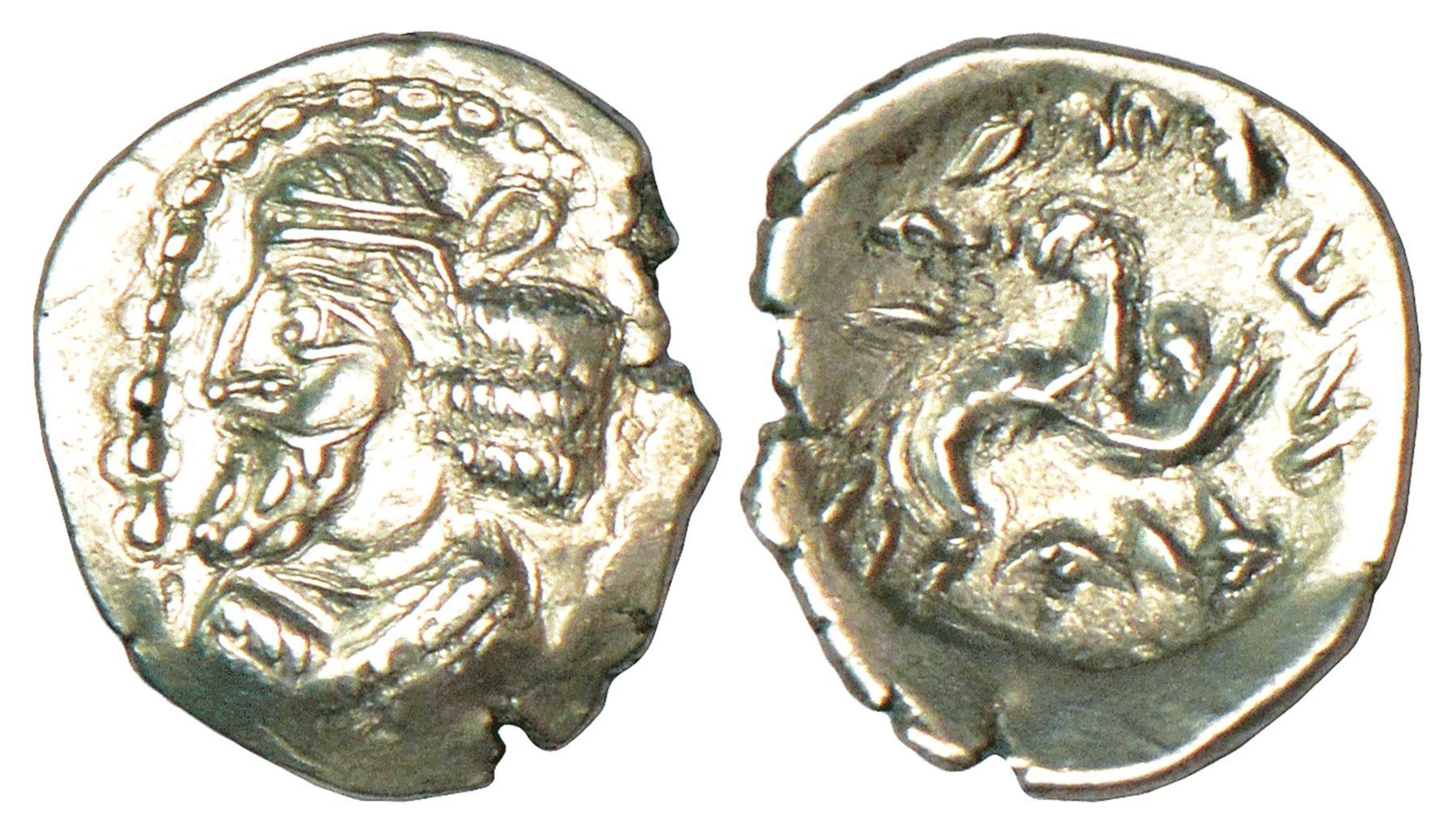 Kings of Persis (South Iran), silver obol of Pakor I (1st century AD), Istakhr (Persepolis) mint, 0.72g. Obv: Diademed bust facing left. Rev: Triskeles with arms curved counter-clockwise, aramaic legend around.