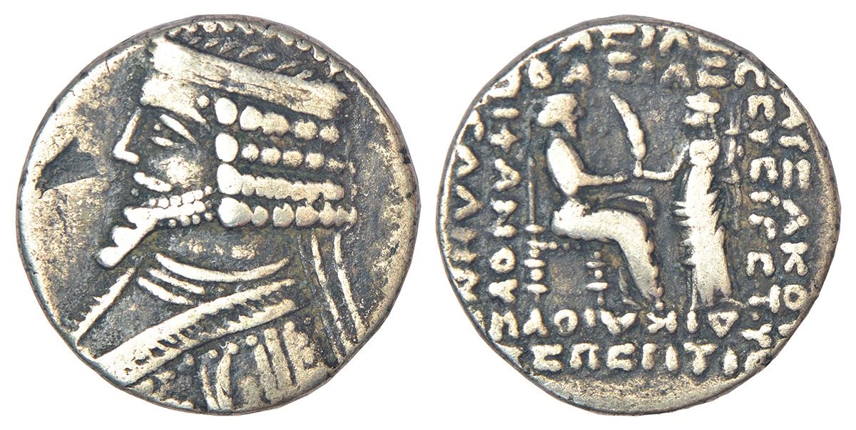 Parthian Empire, silver tetradrachm of Phraates IV (38-2 BC), dated 28x of Seleucid Era (around 25-20 BC), month of January (PERITIOU in Greek), MAC 584, 14.98g. Obv: Bearded bust of king, wearing diadem. Rev: In centre, king seated on throne receiving palm frond from goddess Tyche; Greek legend composed of titles and the date around.