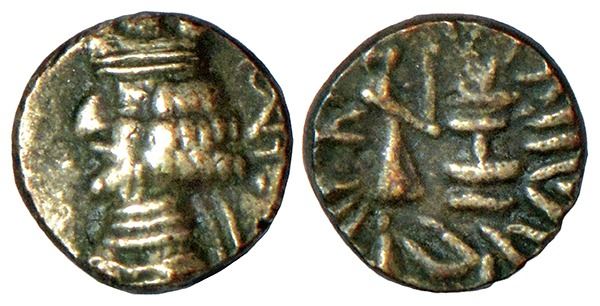 Persis, rulers under Parthian sovereignty - silver obol of Ardaxšīr II (Artaxerxes, c. 1st century BC), issued from Istakhr mint, van't Haaff 578d, 0.70g. Obv: Bust of bearded king left, wearing mural crown with battlements, monogram behind. Rev: King standing facing right (on left side of altar), holding sceptre before lighted altar; Aramaic legend around.