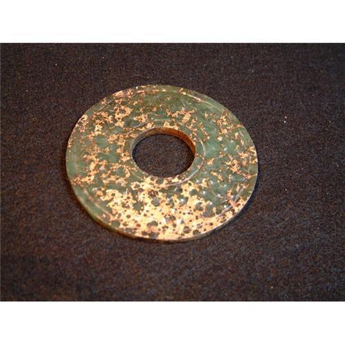 Ancient green jade disk dating to Eastern Han period, circa 100 CE. The sides are decorated in relief with rice grain design. Size: 9 cm. (3.5" diameter). Estimated retail value: $1200. Patchy areas of calcination are present on the green spinach jade of highest quality.