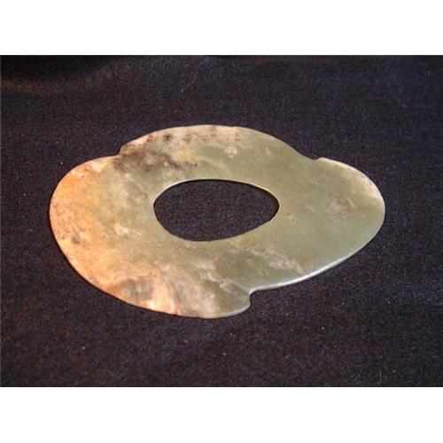 Ancient jade carving dating to Eastern Han period. It has a large central perforation and 3 side indentations. Used as an astronomic device during Han period. Size: 15 x 11 cm. (6" X 4.25"). Estimated retail value: $2500.